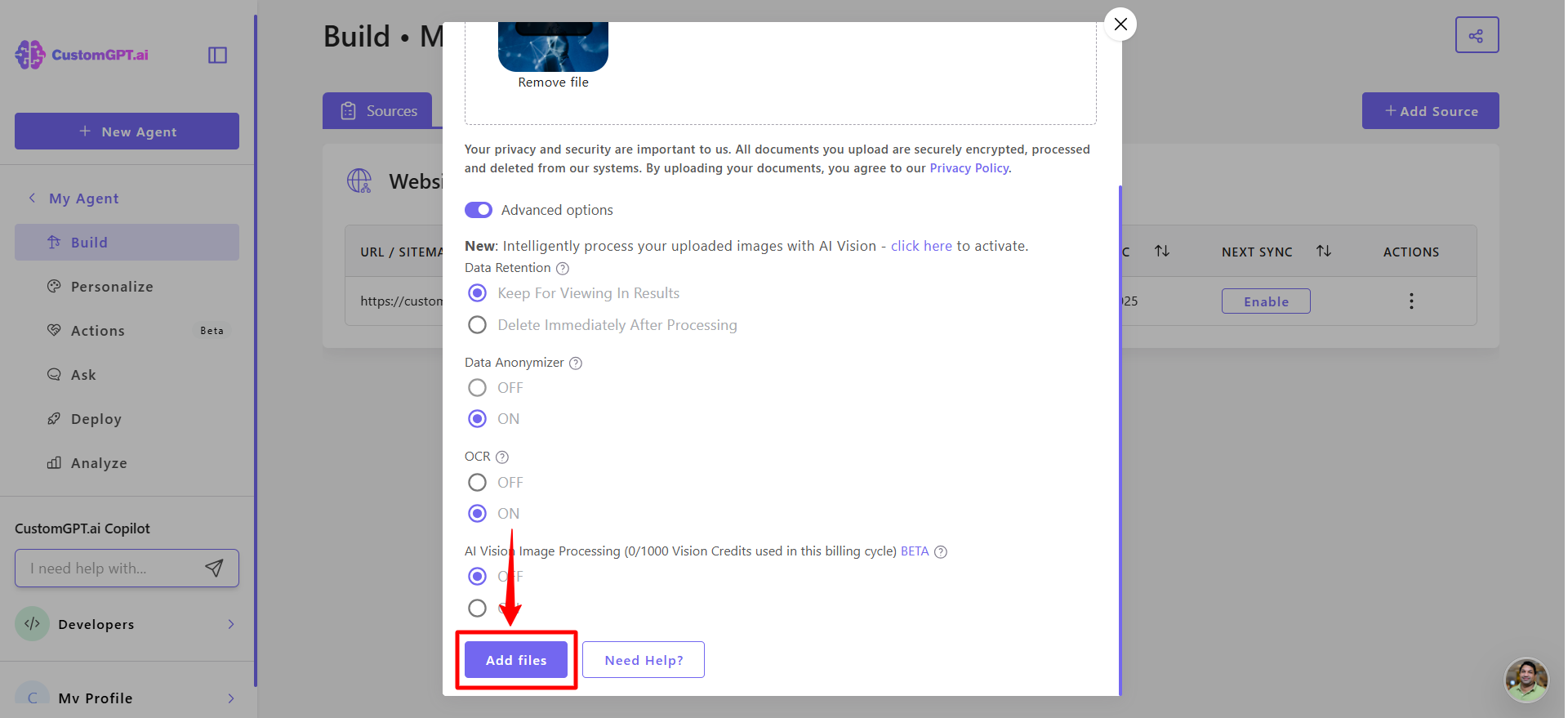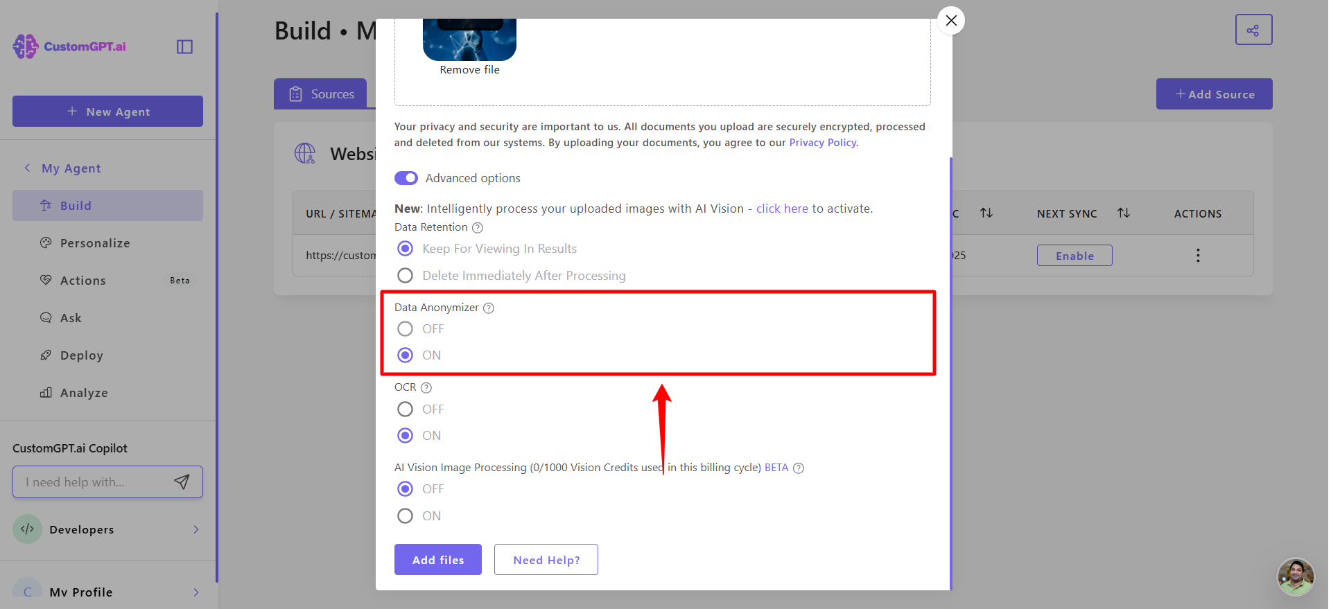 - Click Add Files to finalize the upload with anonymization enabled.