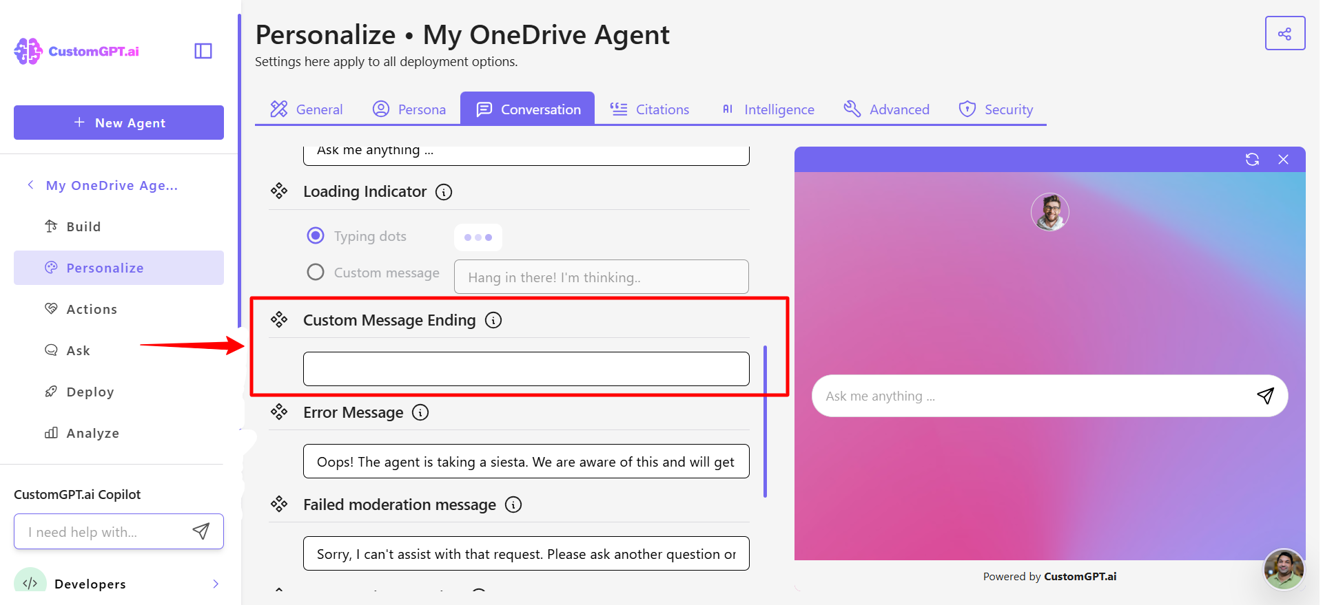 This guide explains how to add a custom message ending to every response generated by your AI Agent.