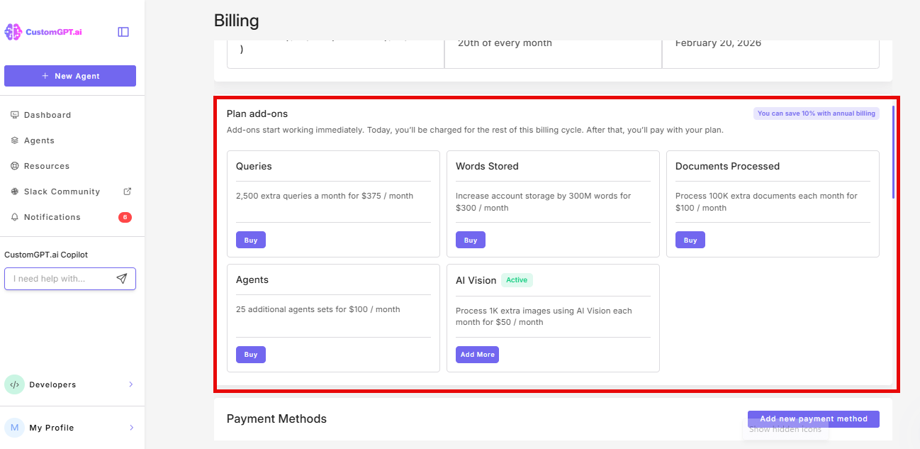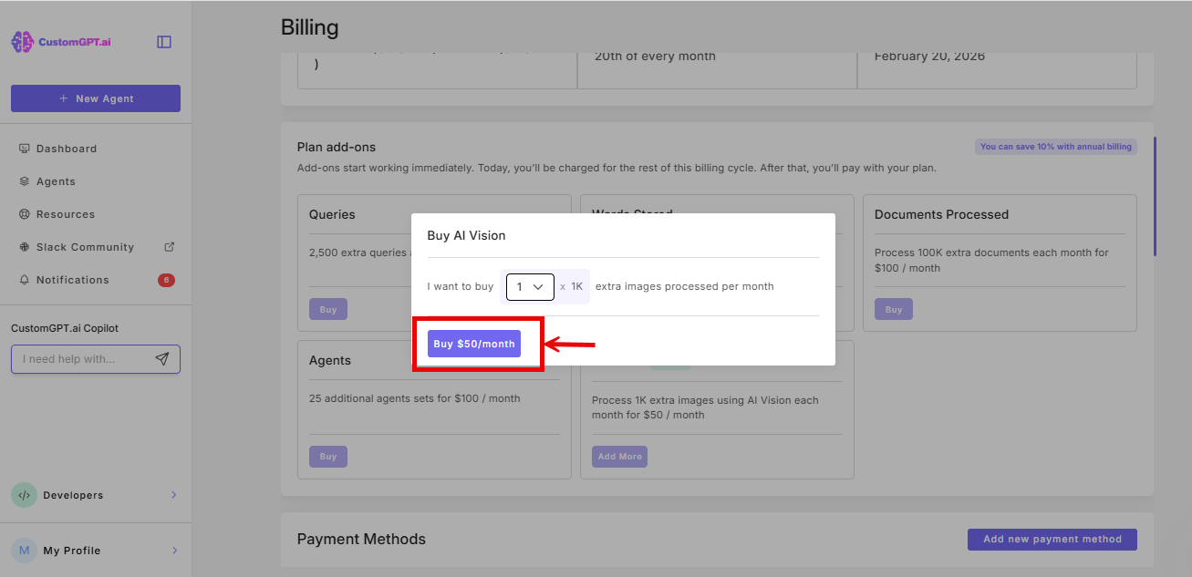 The add extra AI Vision images add-on increases the number of images your agents can process with AI Vision each month. This is useful when you need to analyze more visual content such as diagrams, charts, product images, or documents beyond your plan's base limit.