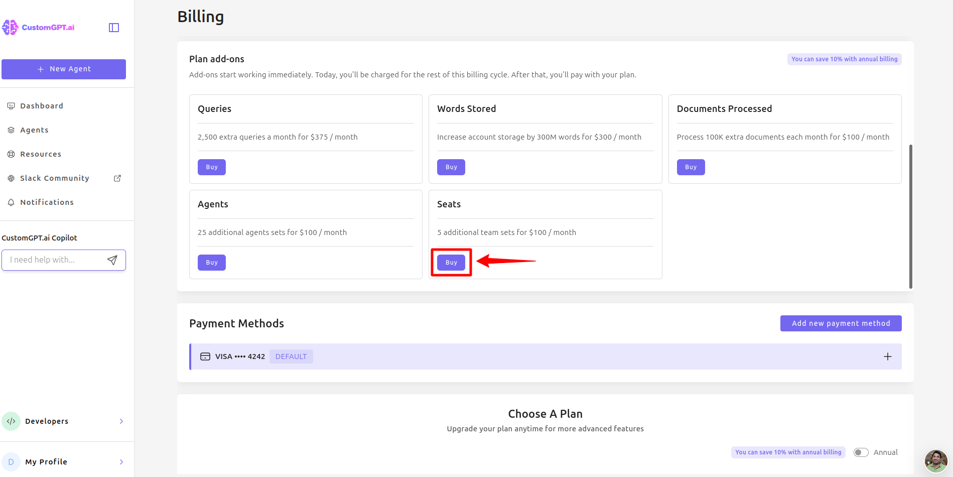 This guide explains how to use the add extra team seats add-on to increase the number of collaborators you can invite to your CustomGPT.ai workspace.