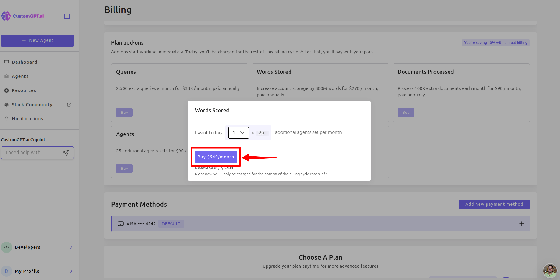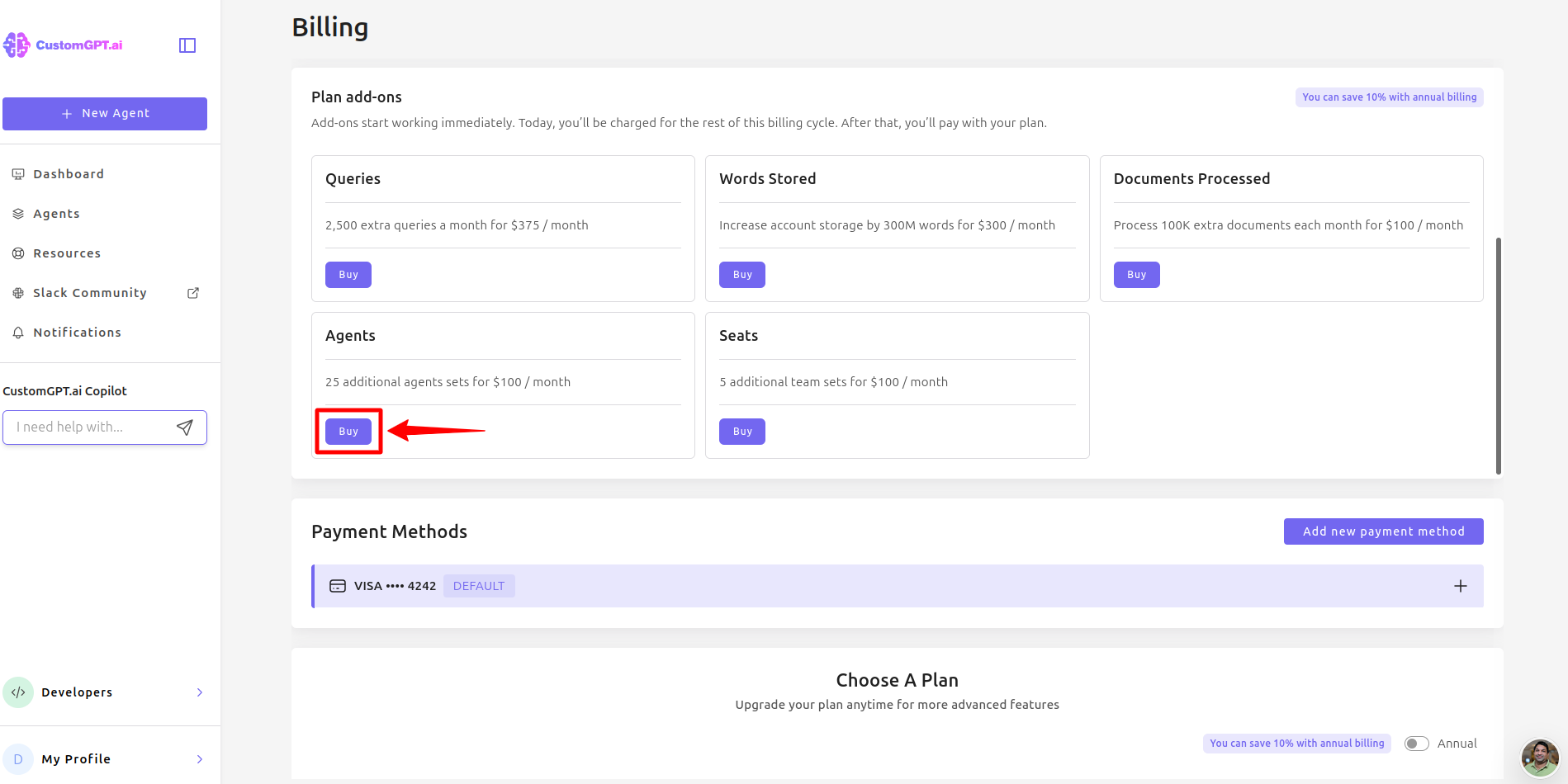 The add more agents add-on expands the number of AI agents you can run simultaneously. This is ideal for organizations managing multiple projects, departments, or client work under a single account.