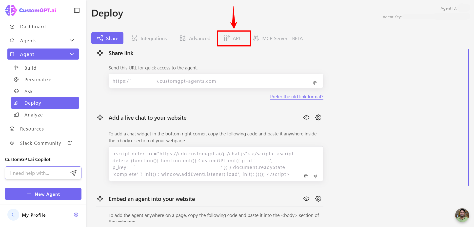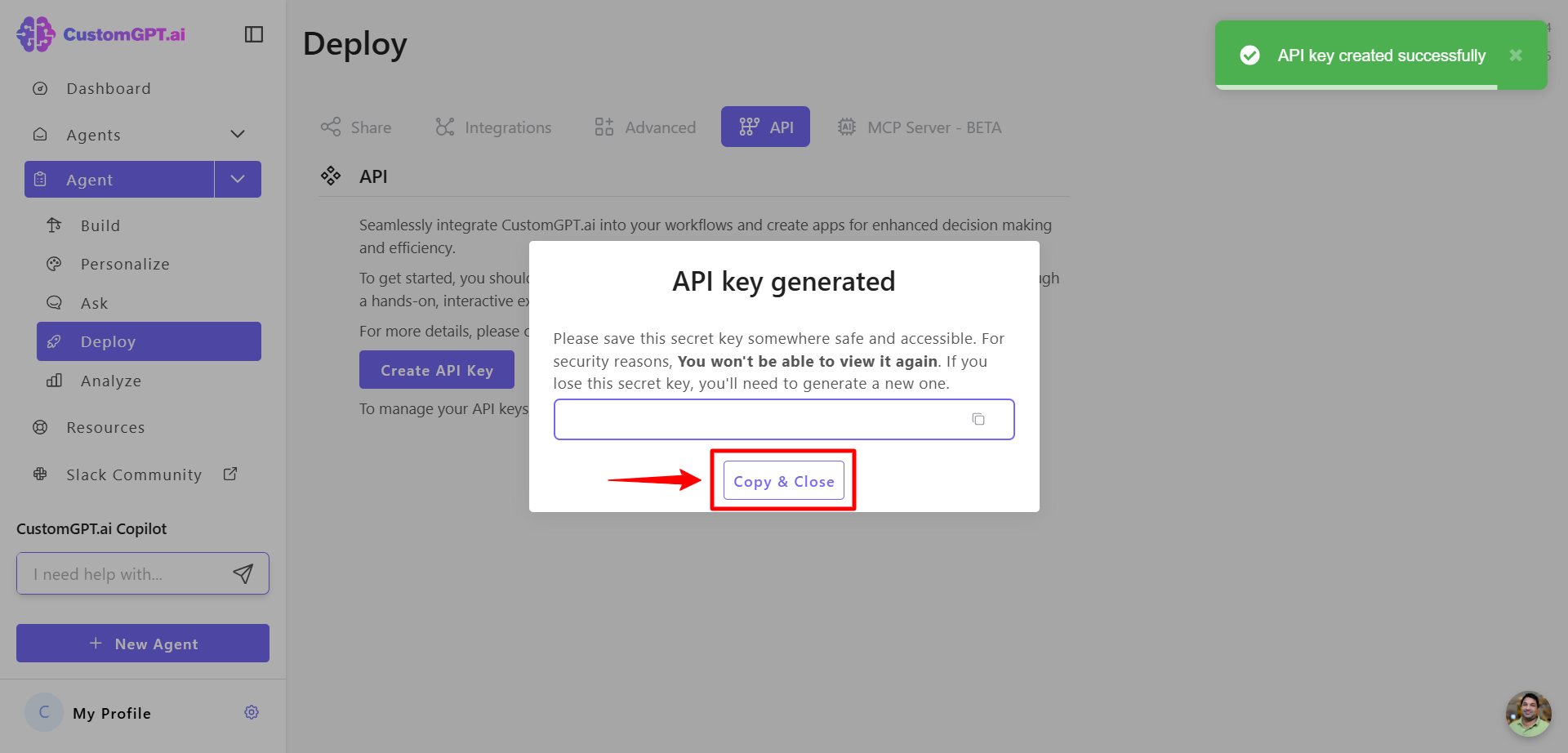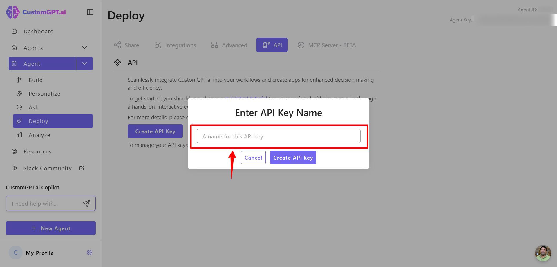 This step-by-step guide explains how to generate an API key to integrate your CustomGPT AI agent into other applications.