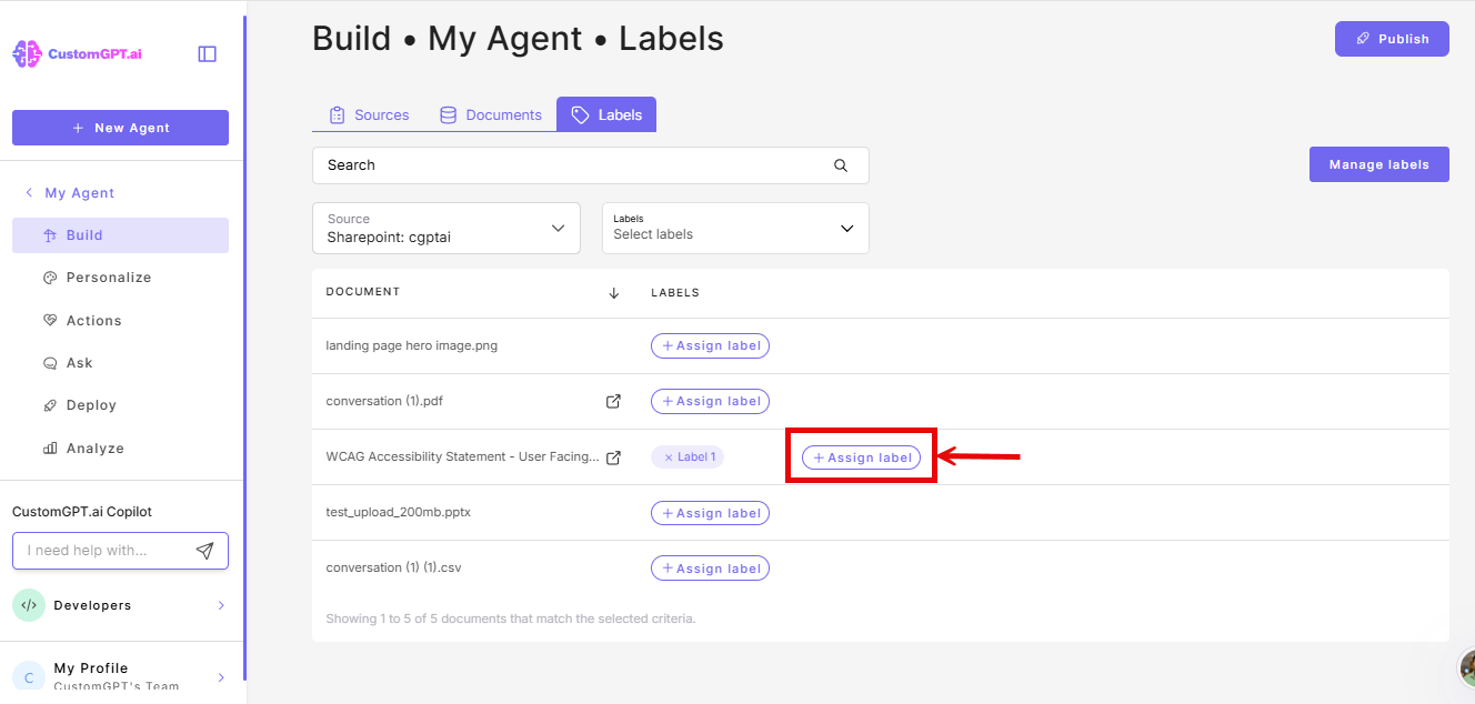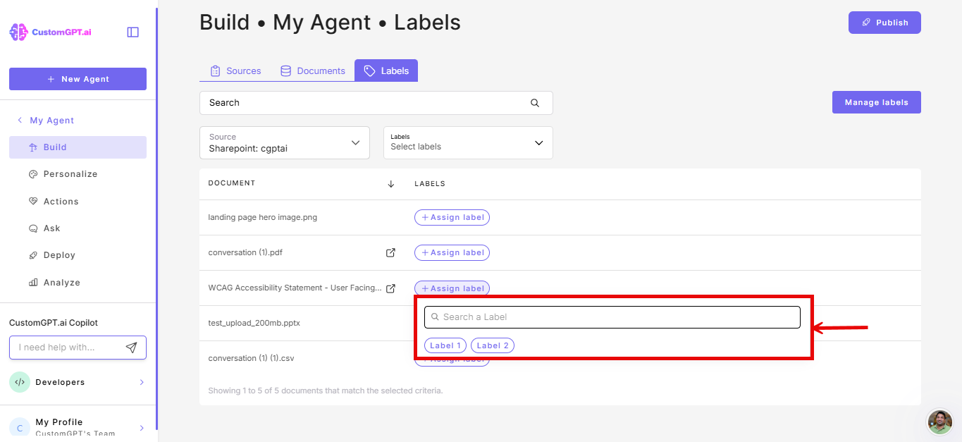 Labels tag knowledge base pages so your agent knows which content to use and when. You can assign labels from two places on the Build page - where you manage your agent's knowledge base and settings: the Labels tab (faster, with bulk support) or the Documents tab.