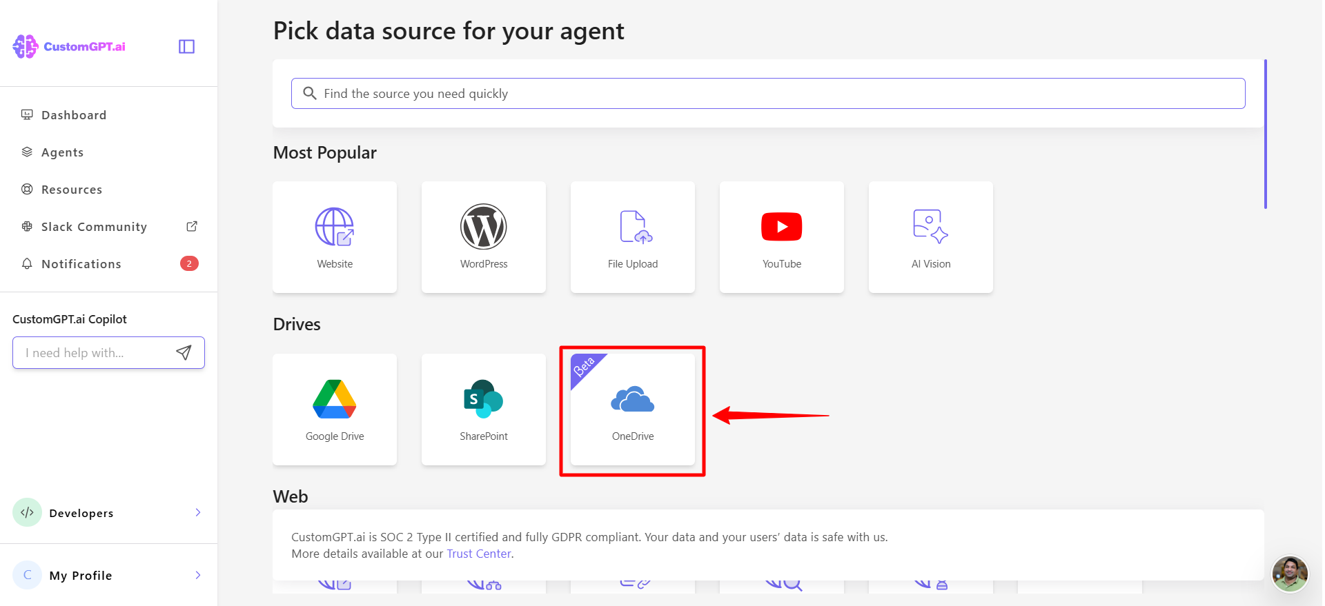 This step-by-step guide explains how to connect your OneDrive account to CustomGPT.ai to import and use documents stored in your OneDrive folders.