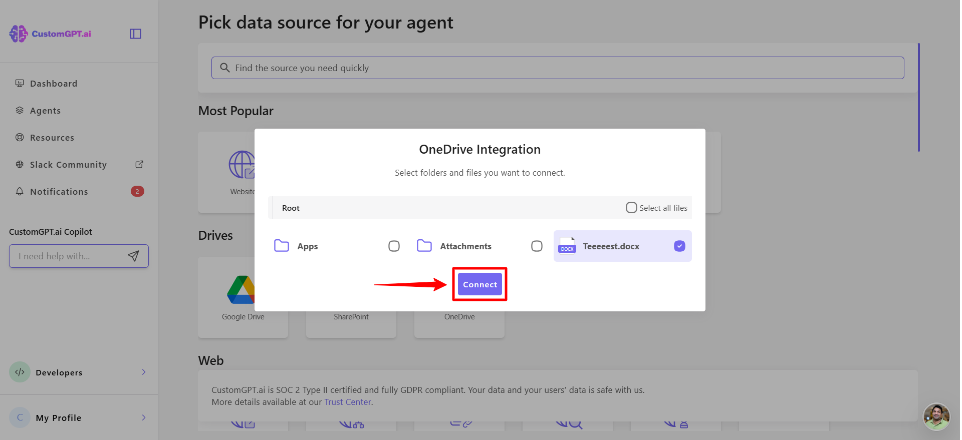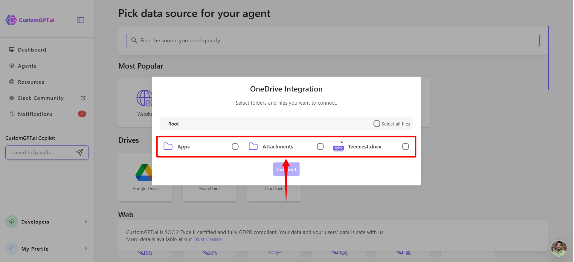 - When prompted, grant the required permissions to the CustomGPT.ai app and select the folder or file you want to integrate.