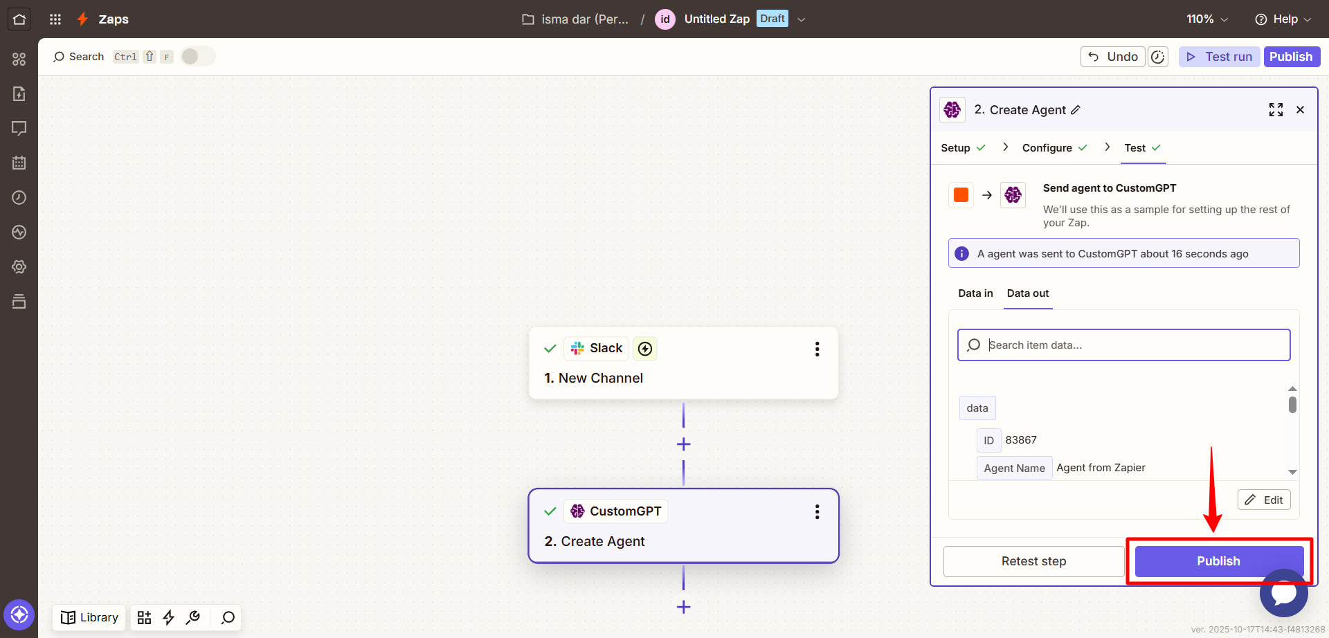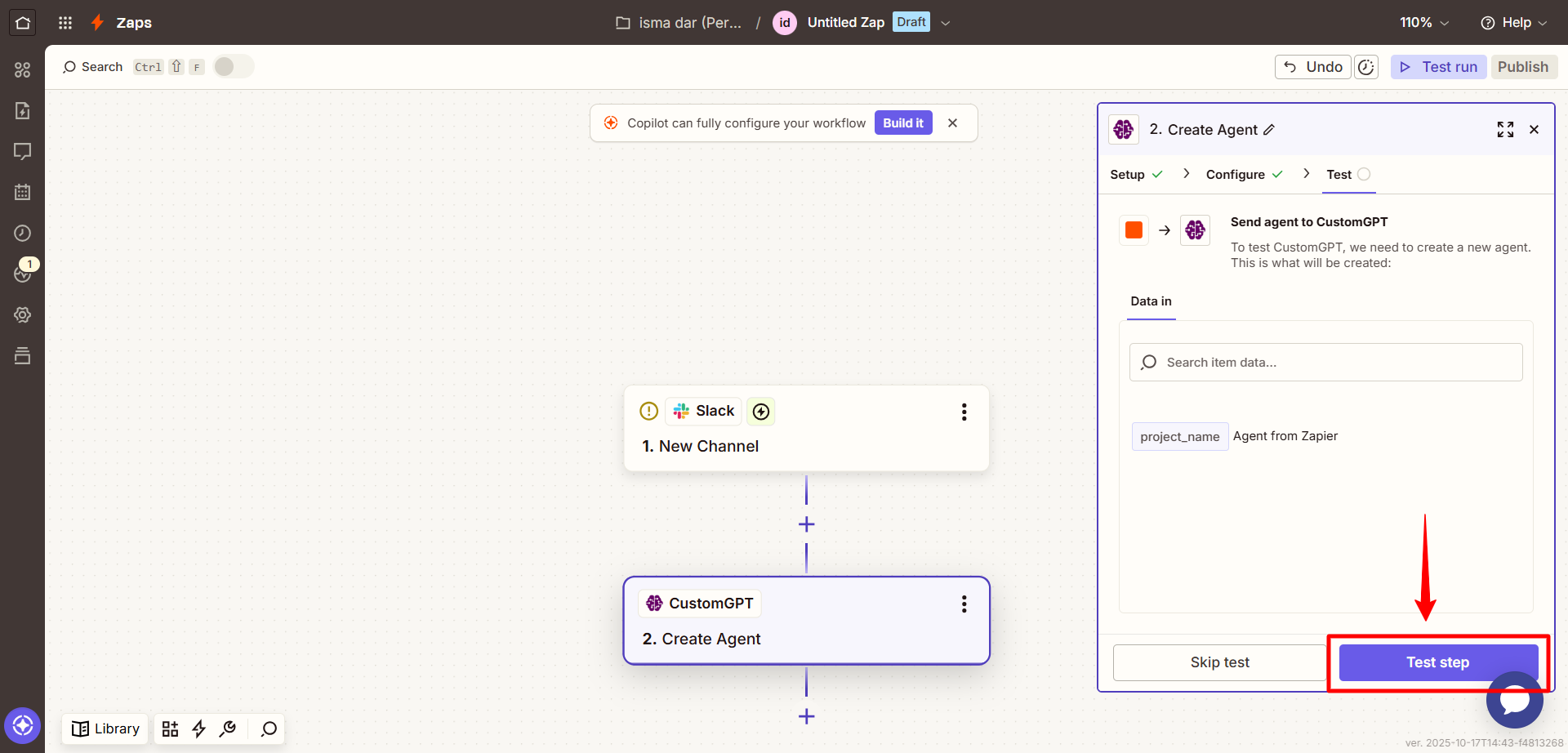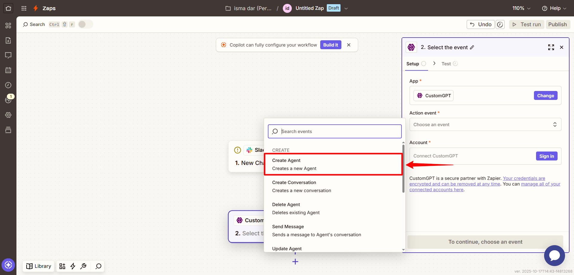 The Create Agent action allows Zapier to instruct CustomGPT.ai to generate a new agent in your workspace. This means that when a specific event happens in another app (your “trigger”), CustomGPT will automatically create an agent with the name you provide—without any manual setup.