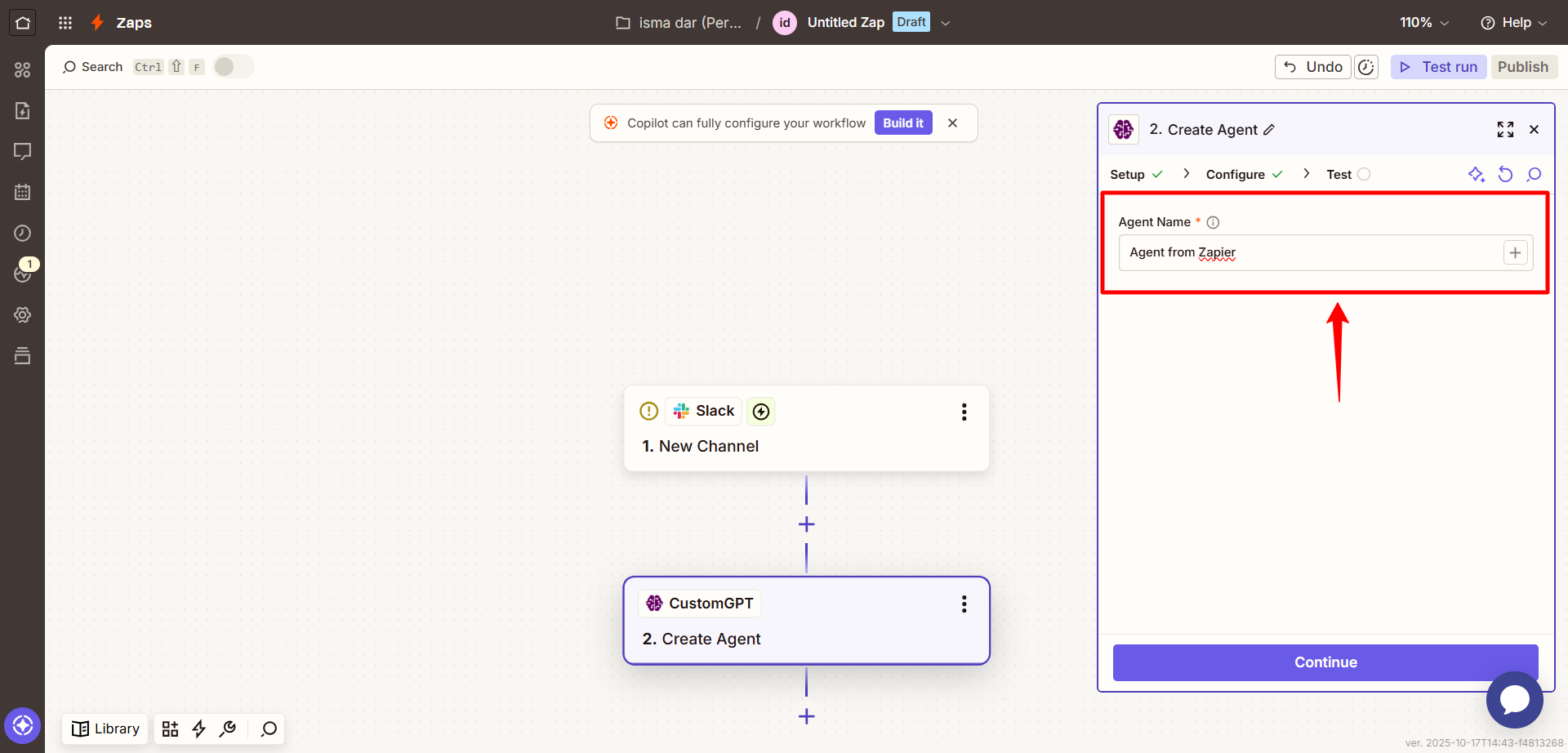 - Under Set up action, you’ll see a field labeled Agent Name. Provide a static name (like “MarketingBot”) or dynamically map the name from your trigger app (e.g., the full name of a form submitter).