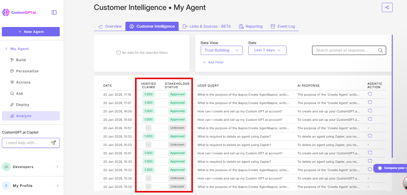 Trust Building shows how well your agent's responses are verified against your knowledge base and whether they meet stakeholder requirements. This metric is only available for conversations where Verify Responses is enabled.