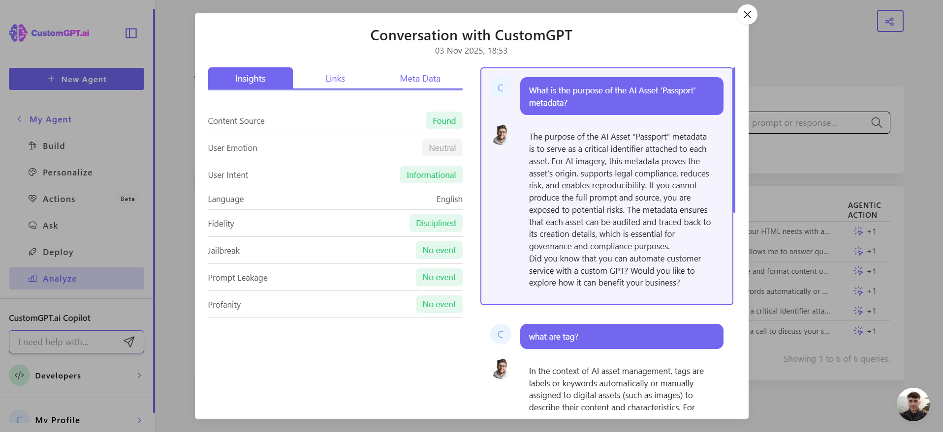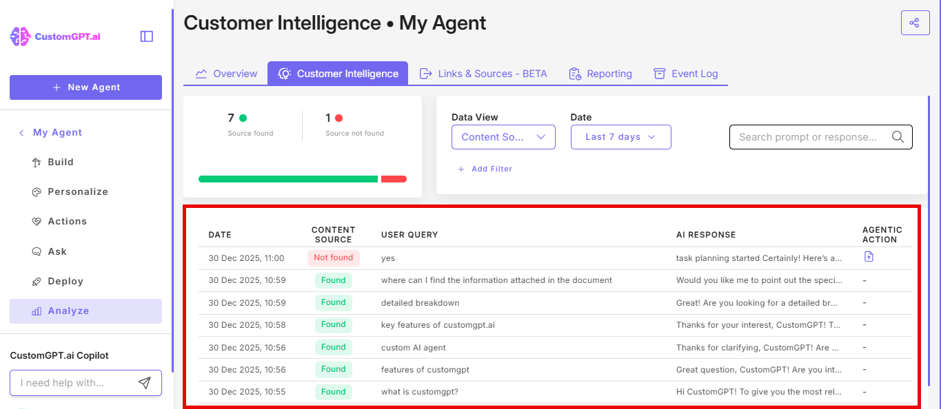 - Content Source Found: shows whether the agent used uploaded documents, URLs, or integrations to form its answer.