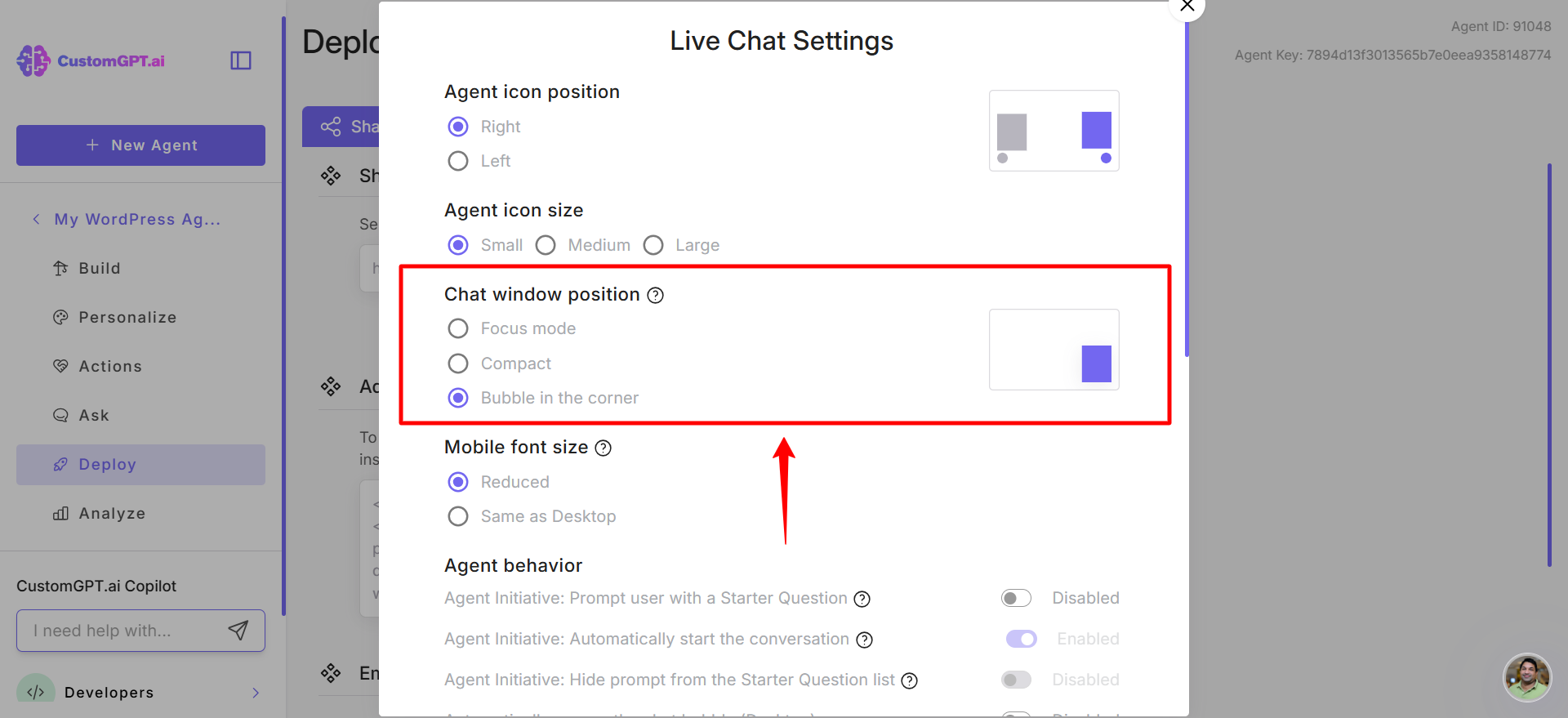 - Sets Live Chat window position to corner bubble (Learn how to configure live chat agent behavior)