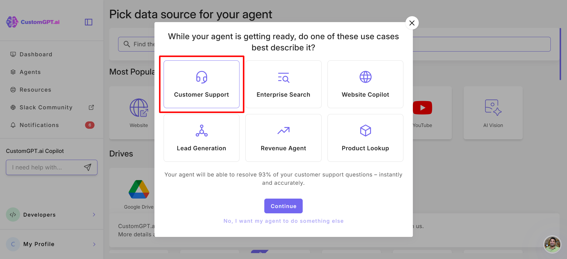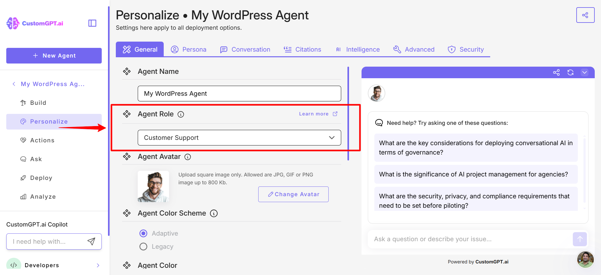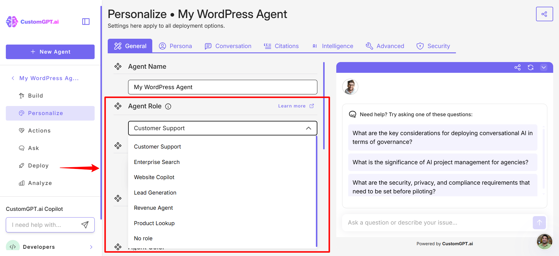 This step-by-step guide explains how to assign the Customer support role to your CustomGPT.ai agent and configure it to resolve up to 93% of customer inquiries instantly and accurately.