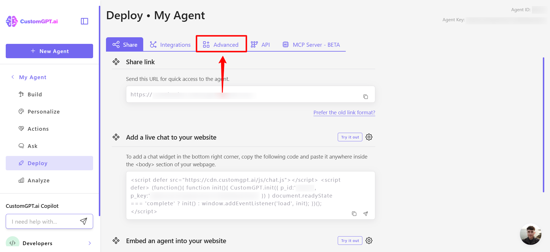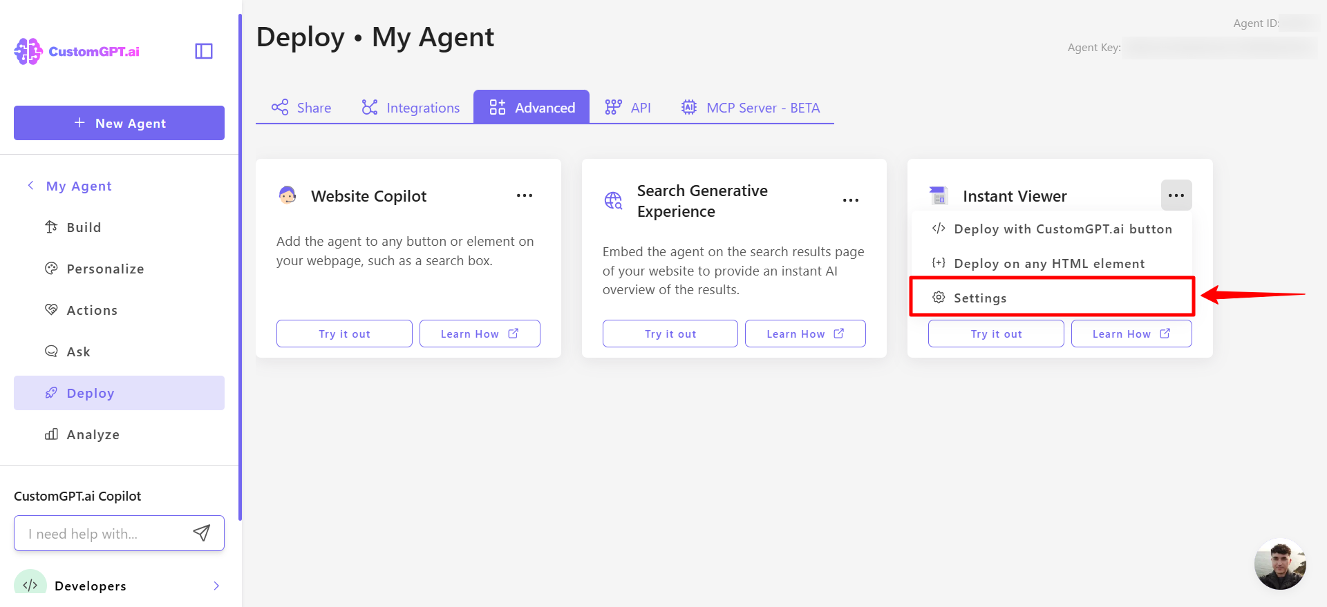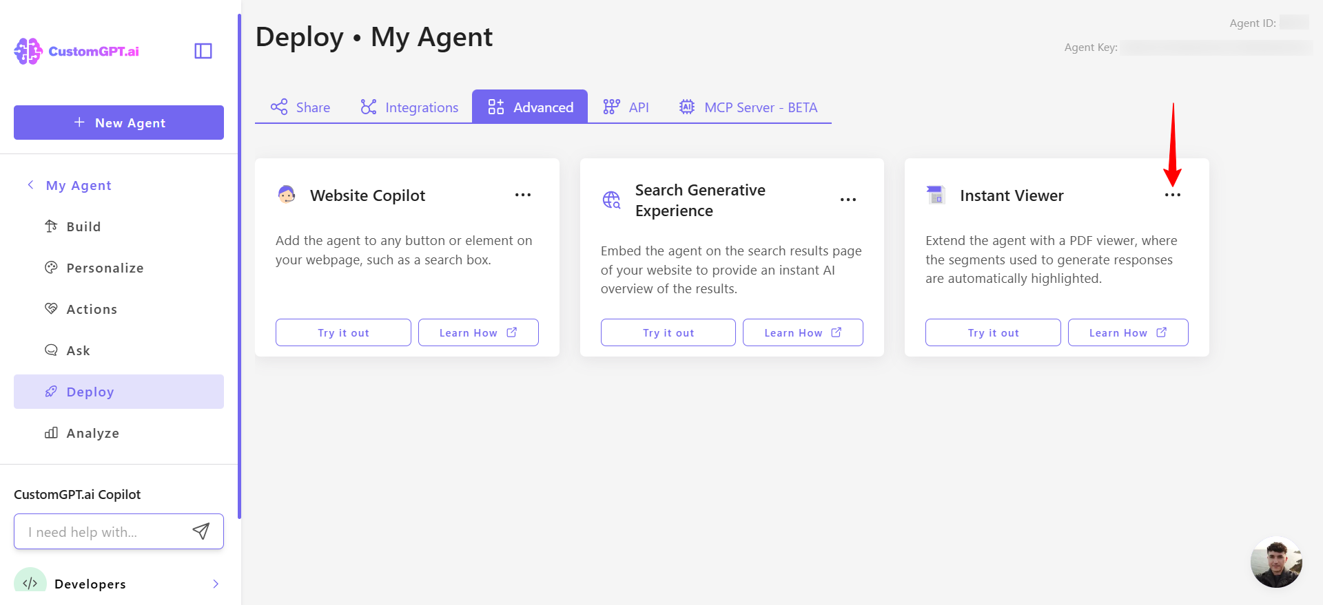 - On your CustomGPT dashboard, click the three dots menu and click Deploy.