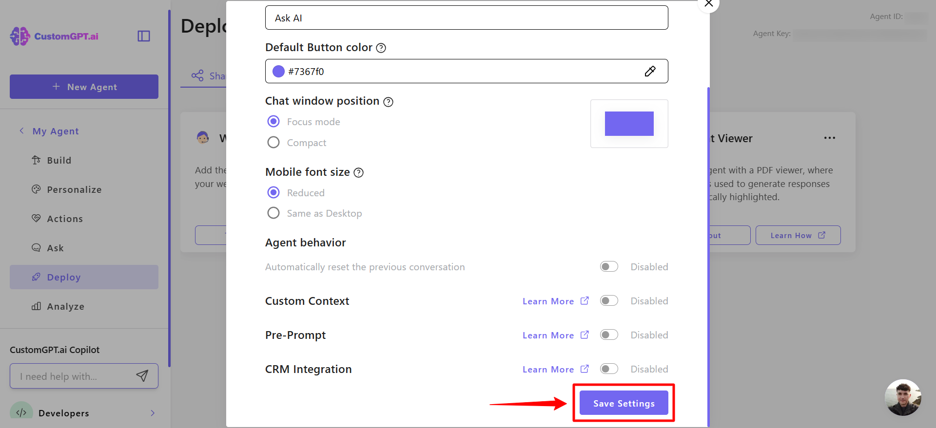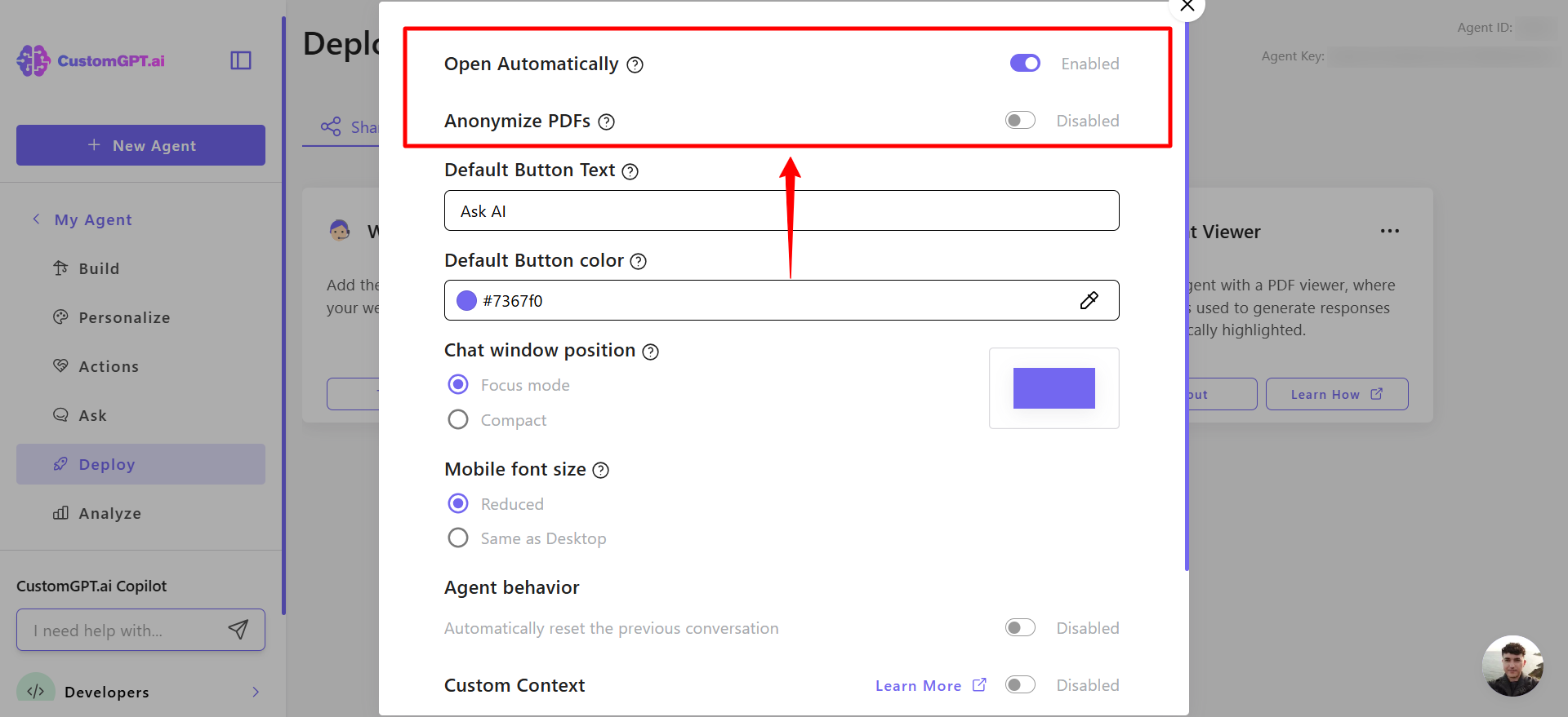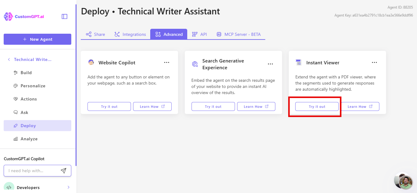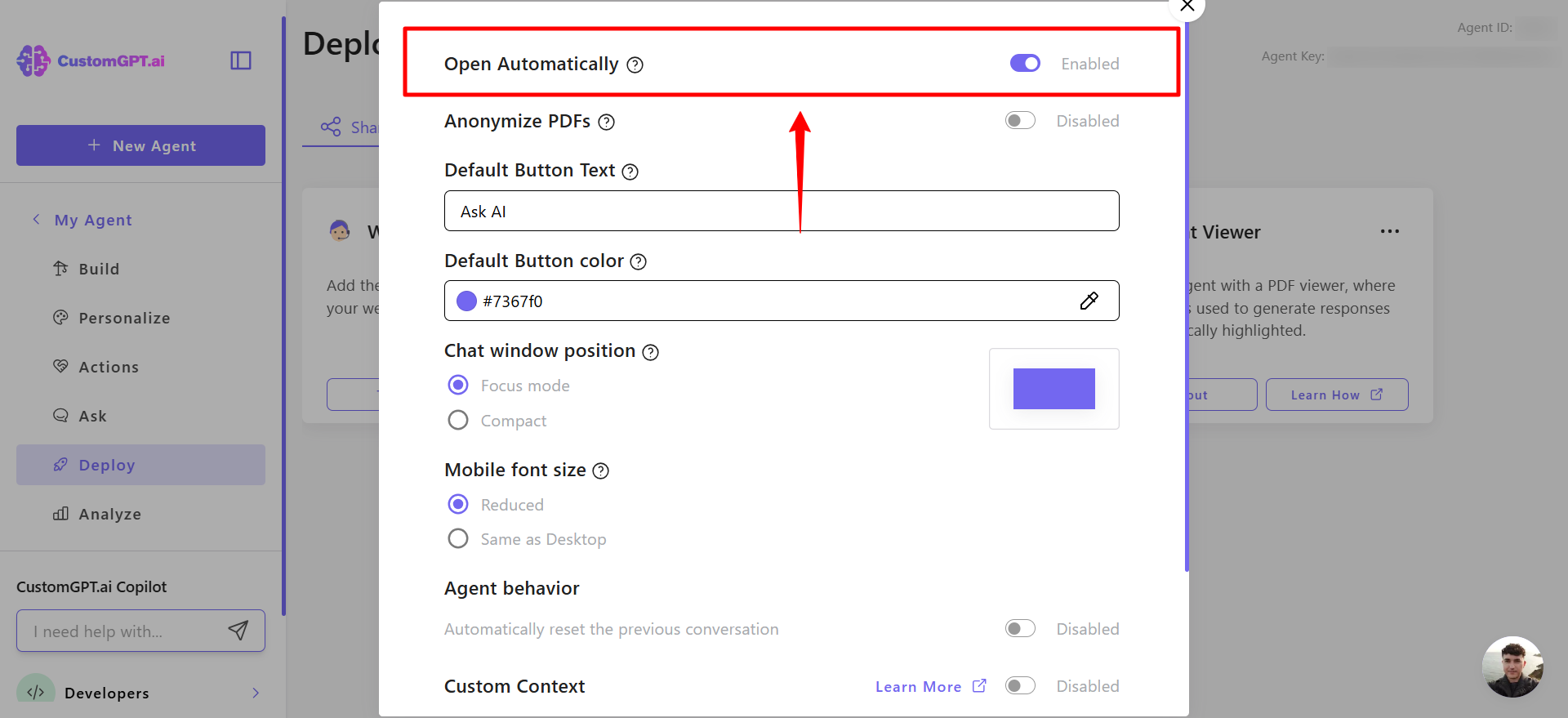 - On your CustomGPT dashboard, click the three dots menu and click Deploy.