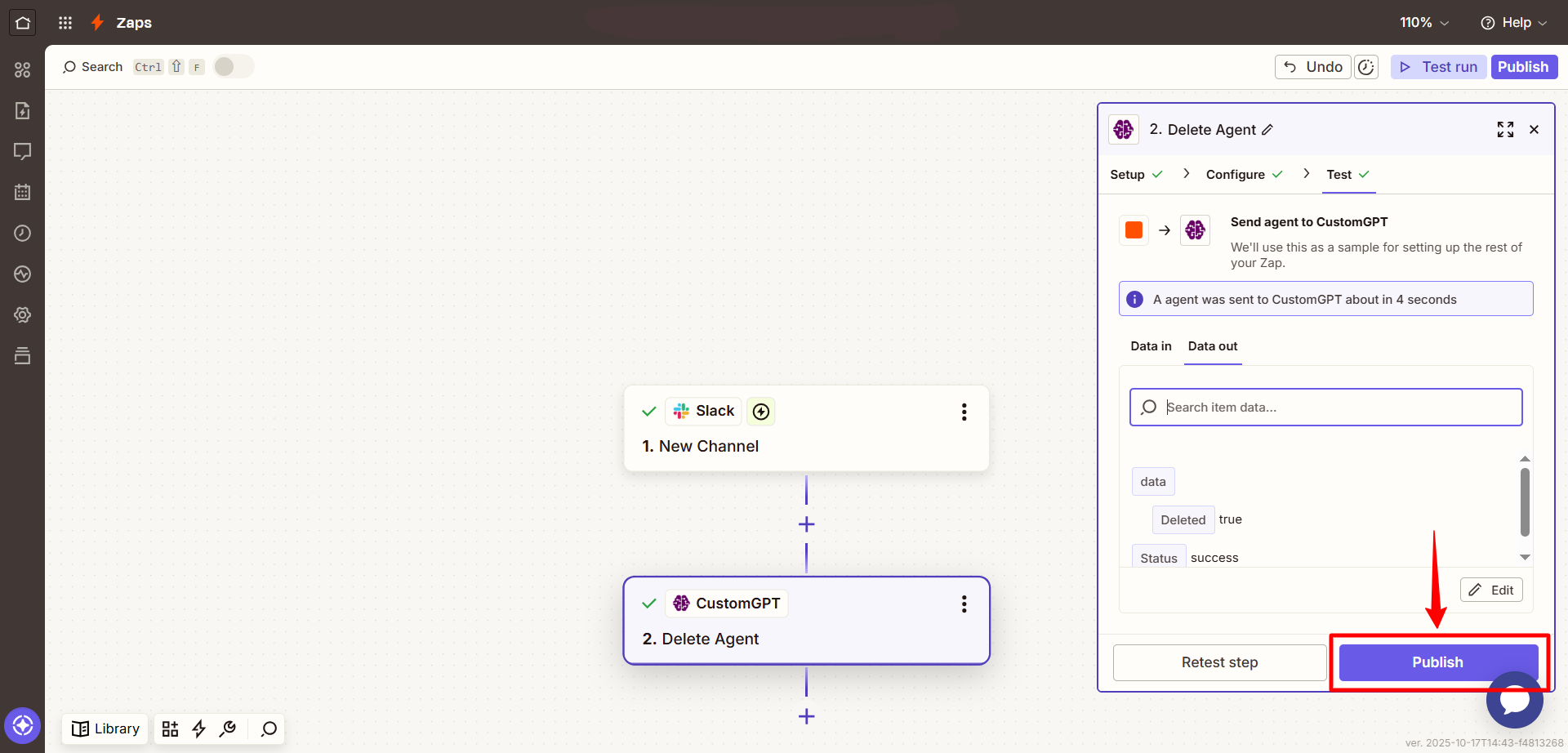 This guide explains how to use the Delete Agent action in Zapier to automatically remove an existing agent from your CustomGPT account as part of a workflow.