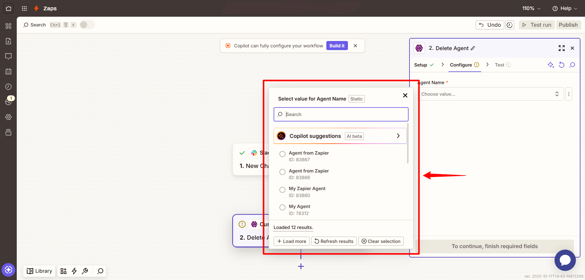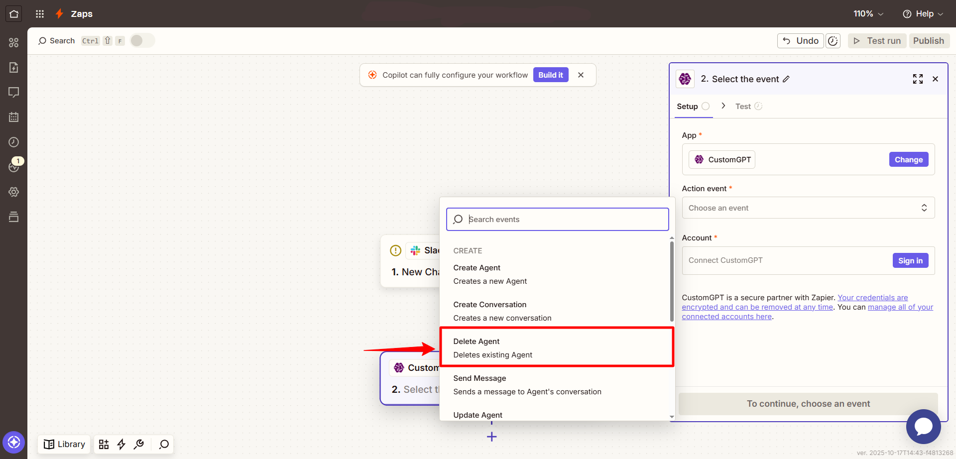 The Delete Agent action allows you to remove a specific CustomGPT agent from your account through an automated Zapier workflow. This is useful when you want to decommission test agents, reset environments, or manage agent lifecycle programmatically.