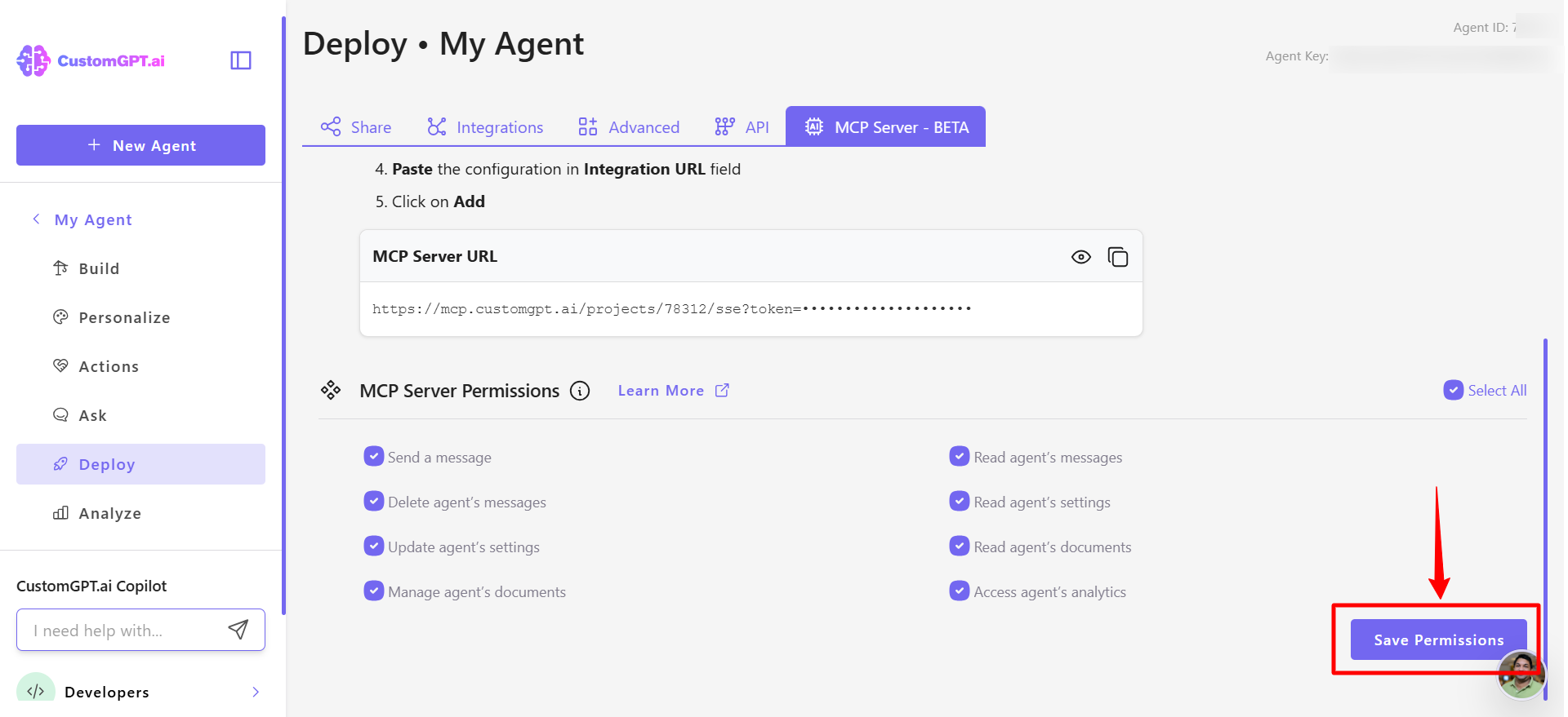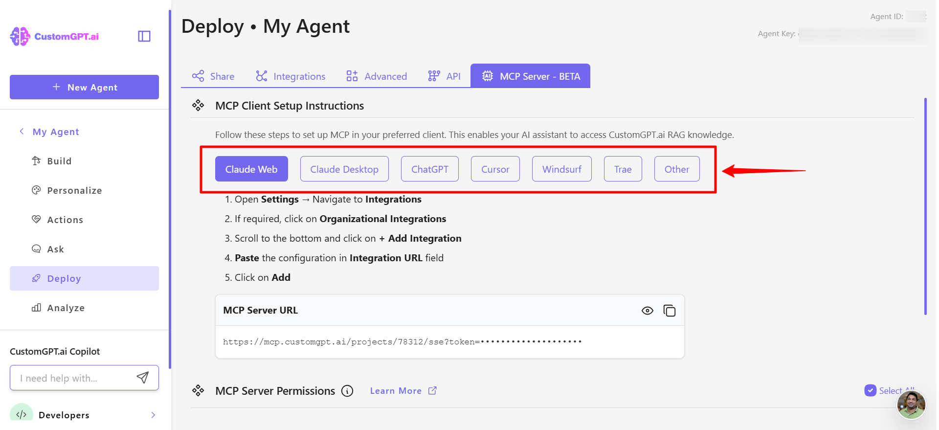 When you enable the MCP deployment option, CustomGPT generates an MCP server that exposes your agent’s tools and capabilities. External AI models can connect to this server and perform actions based on the permissions you allow.