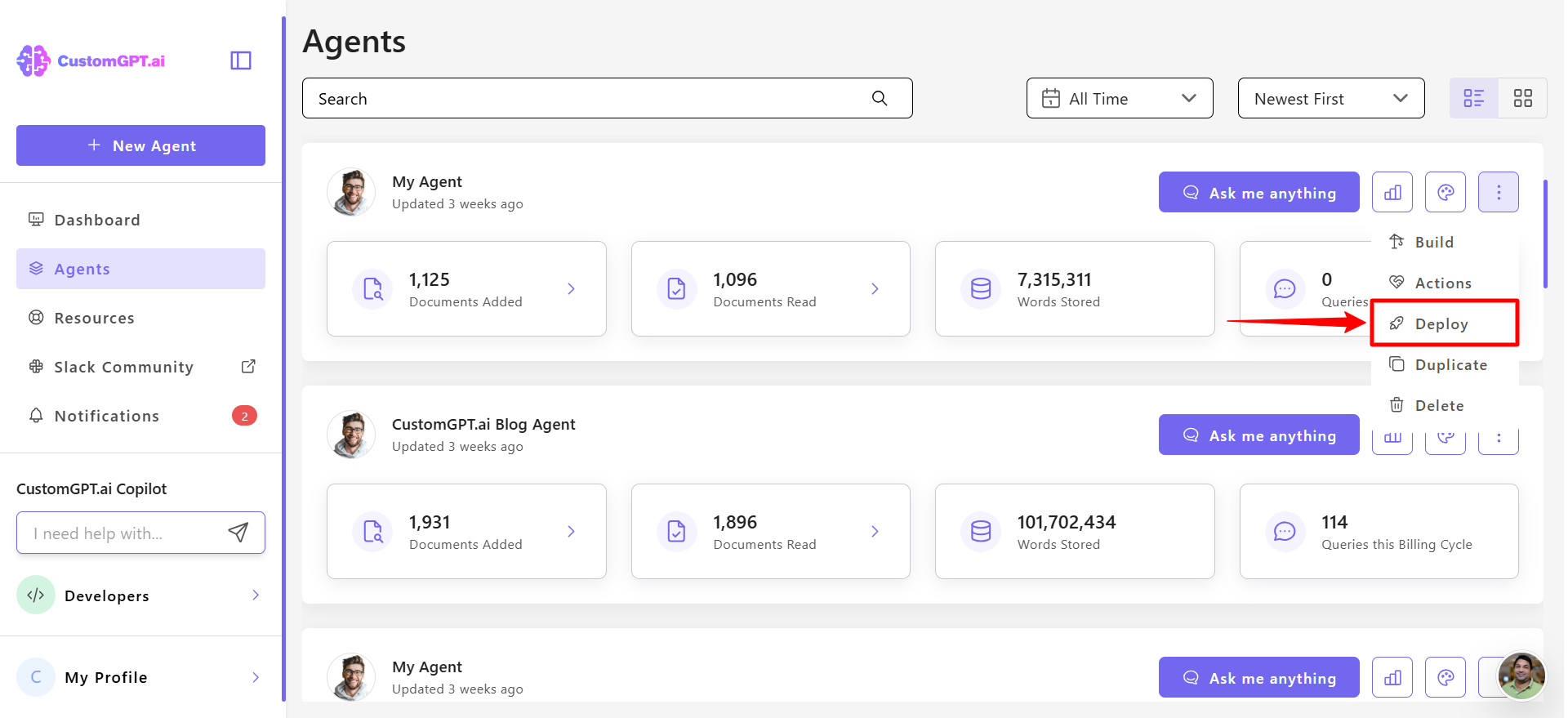- Open your CustomGPT project and click the three-dot menu in the top-right corner and select Deploy from the menu.
