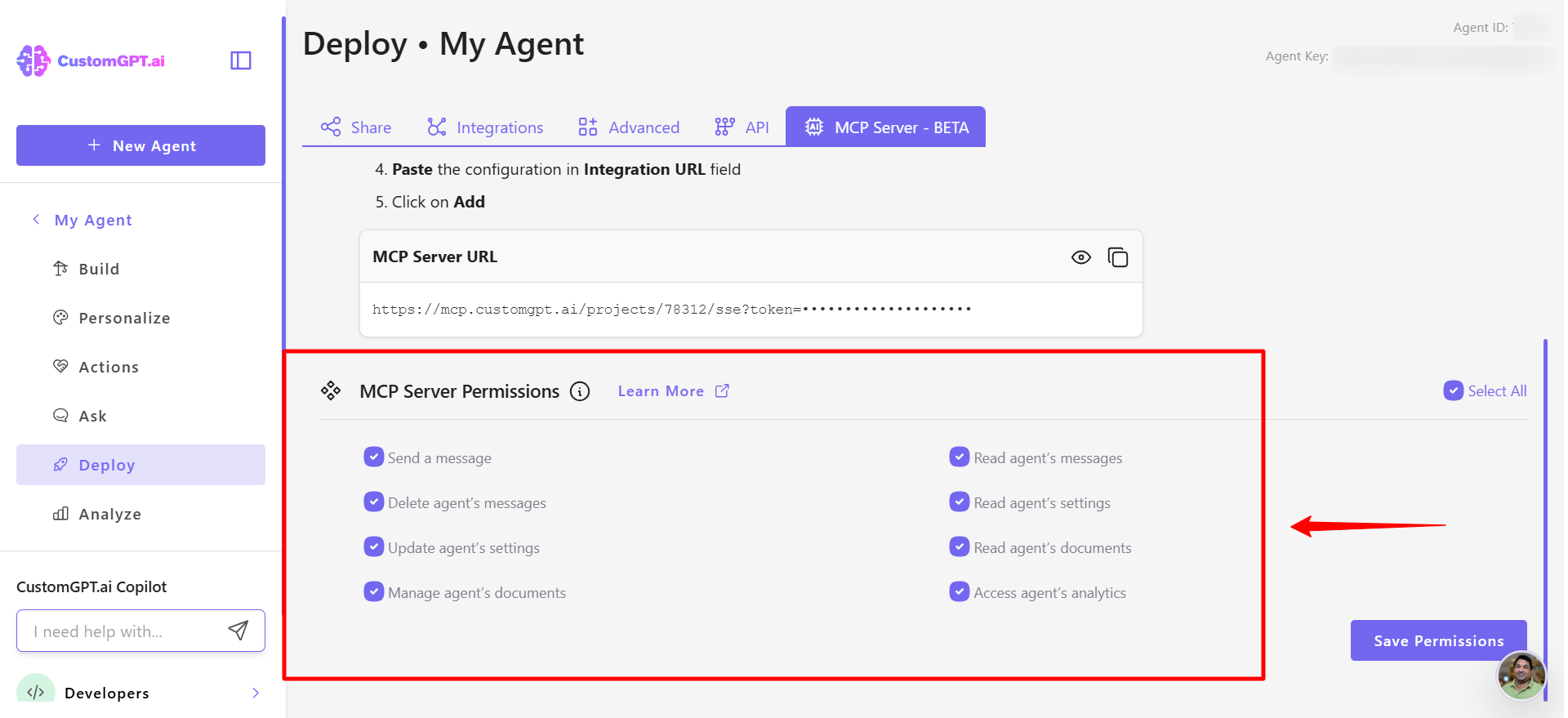 External AI systems can perform additional operations depending on the permissions you enable. You can combine any permissions to match your requirements, like fetching previous conversations, accessing analytics or even managing agent's settings. For a detailed breakdown of all available permissions, see MCP server permissions.