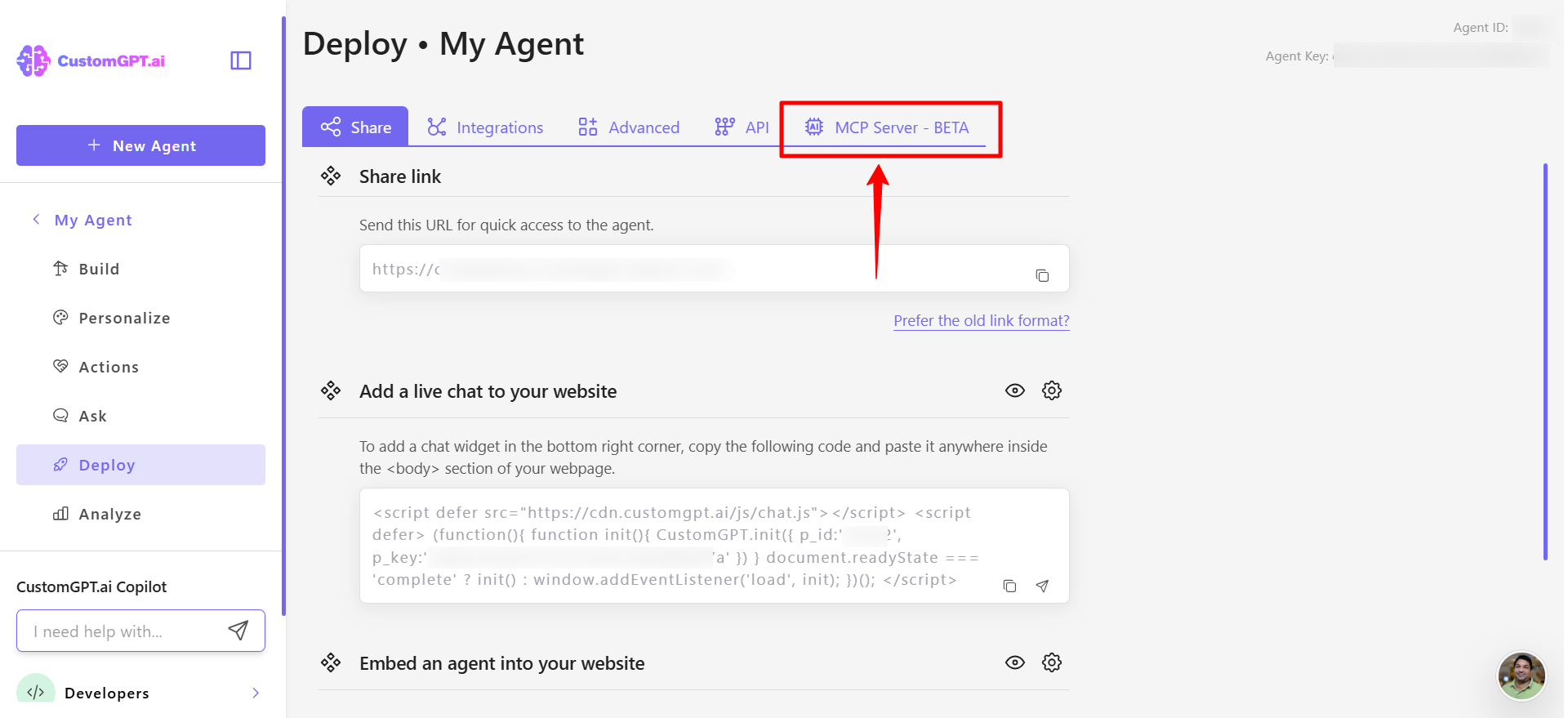 This step-by-step guide explains how to deploy your CustomGPT agent as an MCP (Model Context Protocol) server so it can connect with other AI systems, including Claude, ChatGPT, and any MCP-compatible client. This deployment method allows external AI models to access your agent’s knowledge base and tools through a secure, permission-controlled interface.