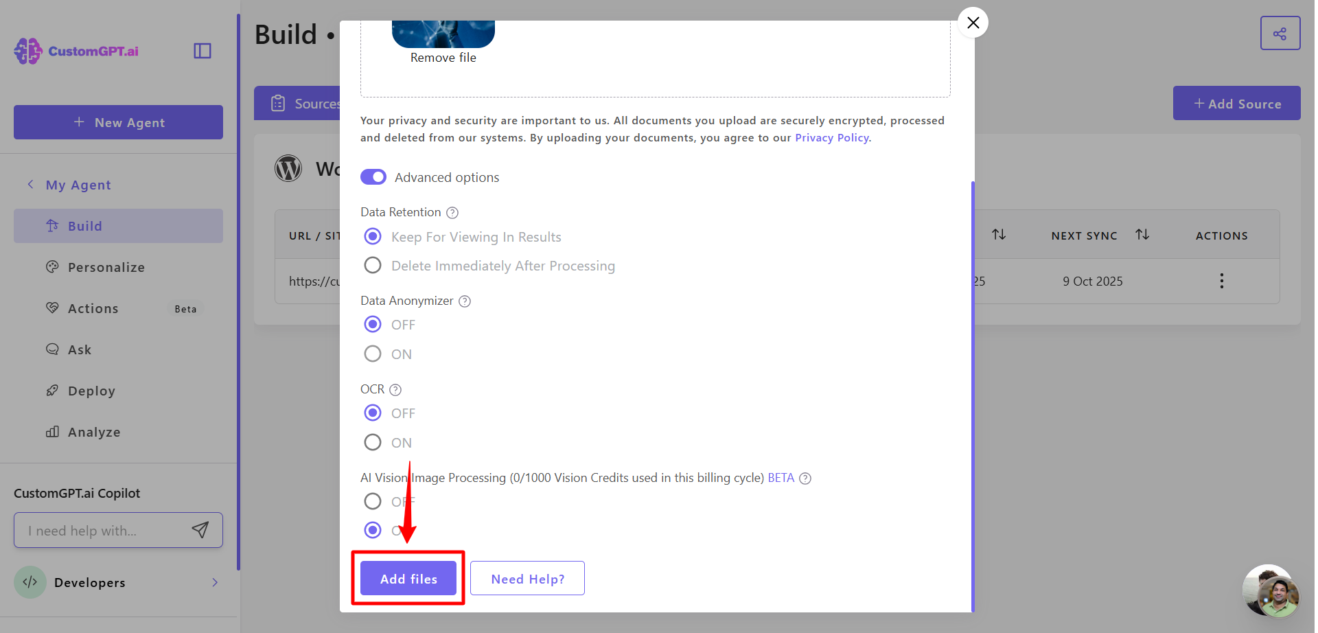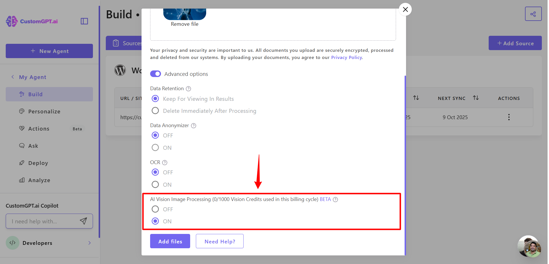 You can enable AI Vision when uploading images to an existing agent or while creating a new one.
