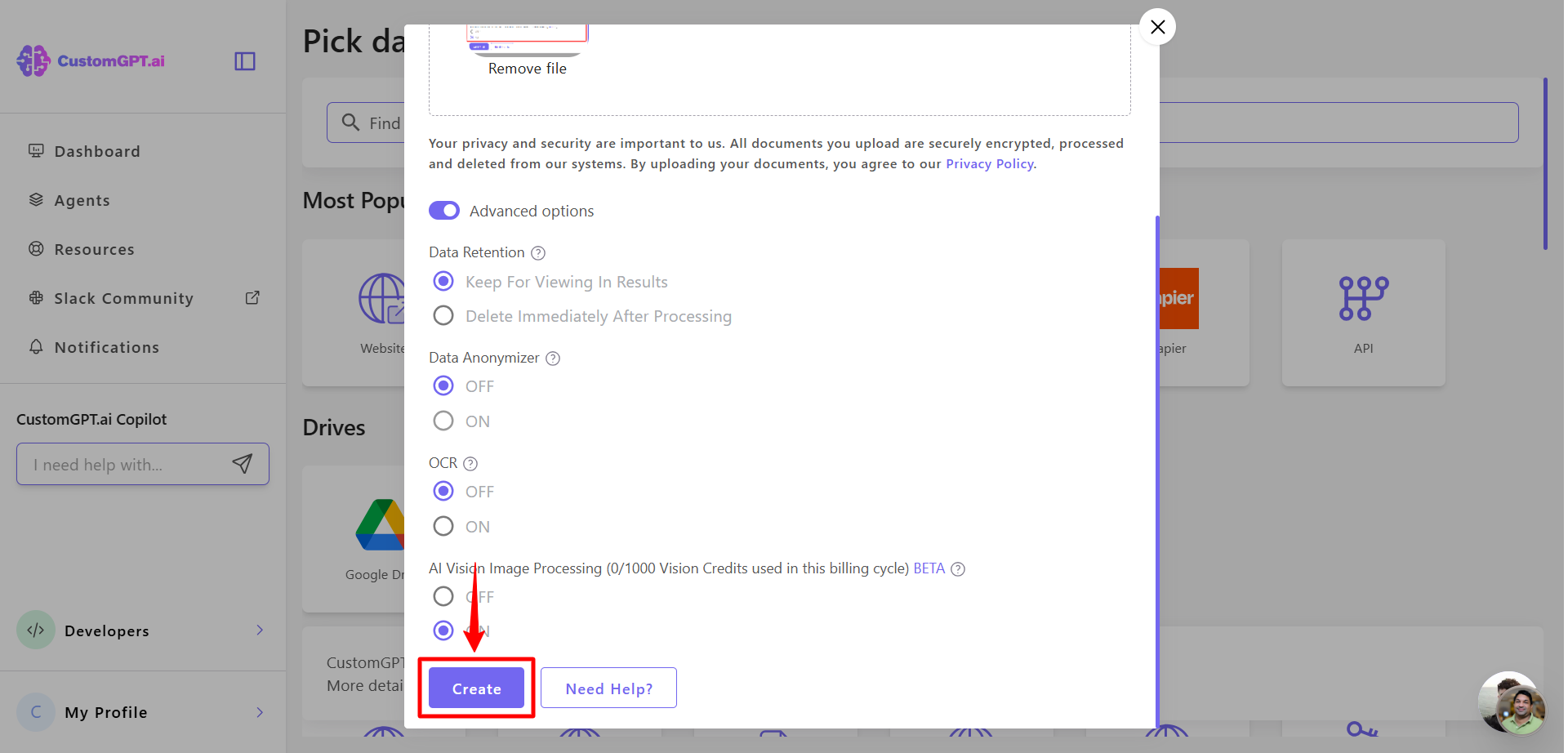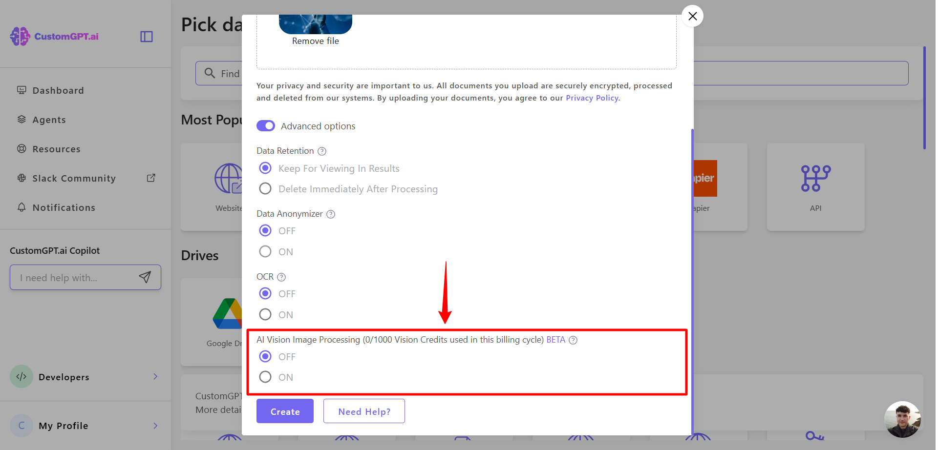 - Scroll down and toggle AI Vision in the upload window to enable intelligent image analysis.