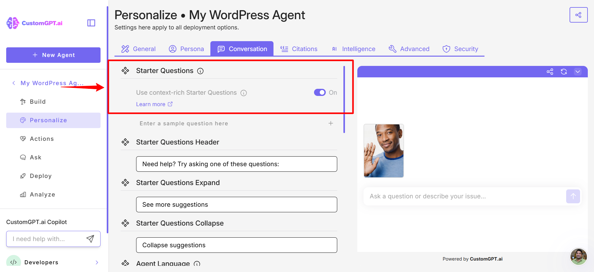 - Navigate to your CustomGPT dashboard, and in the right sidebar click Personalize.