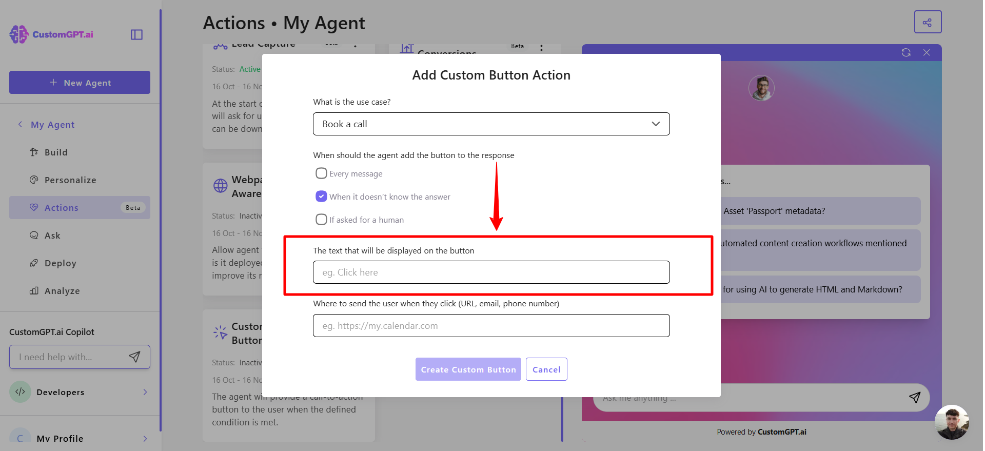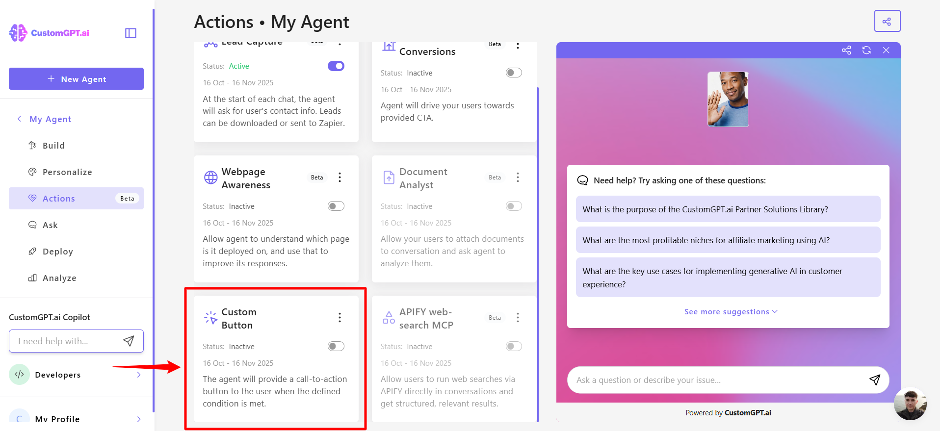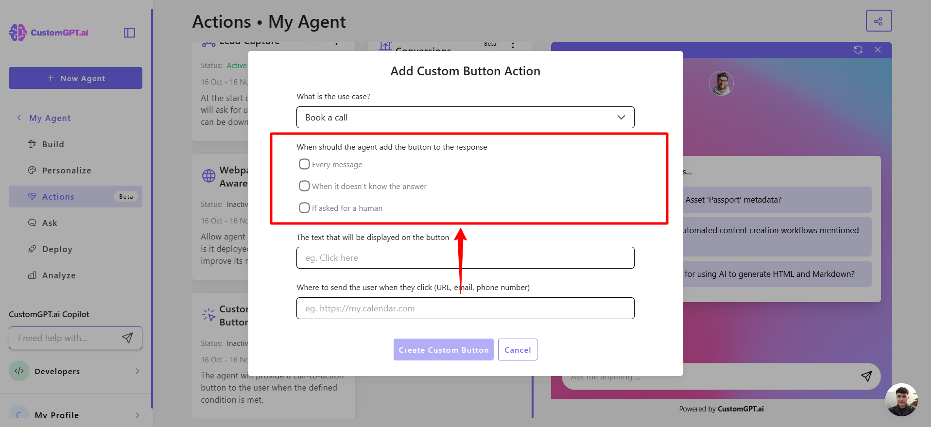 This step-by-step guide explains how to enable the Custom Button Agentic Action for your CustomGPT.ai agent.