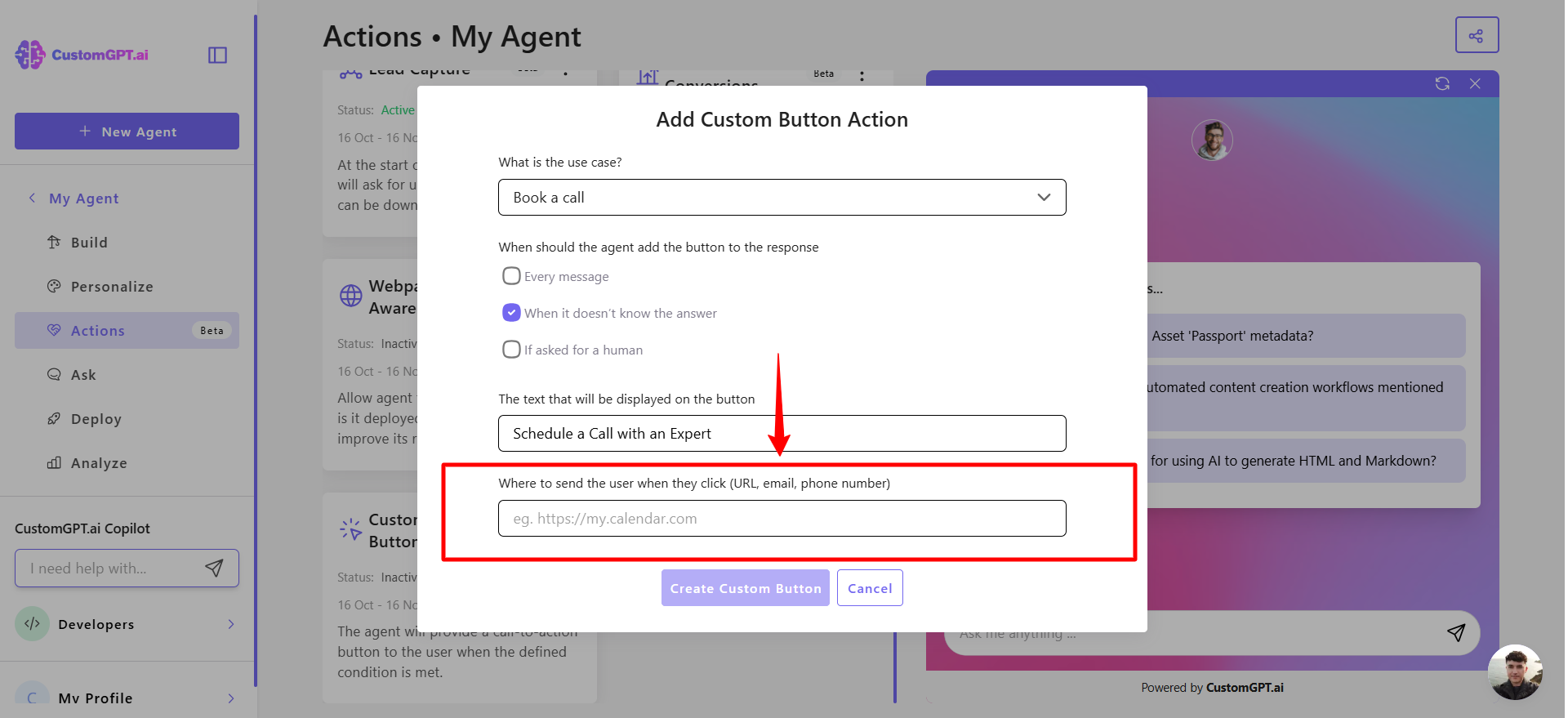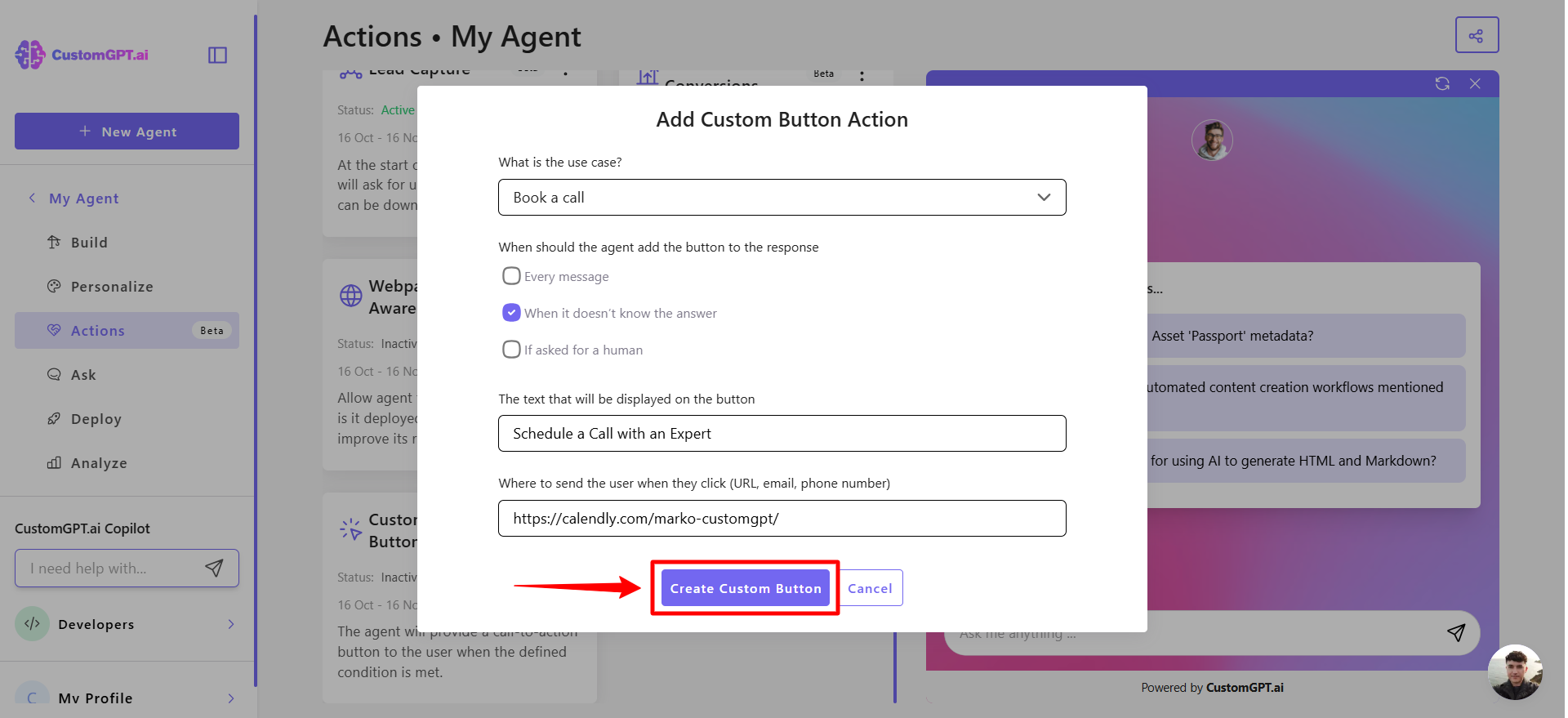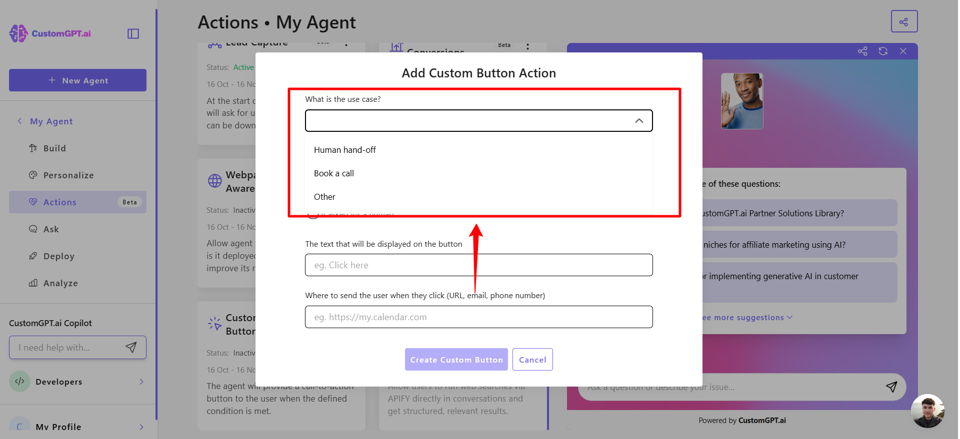 This step-by-step guide explains how to enable the Custom Button Agentic Action for your CustomGPT.ai agent.