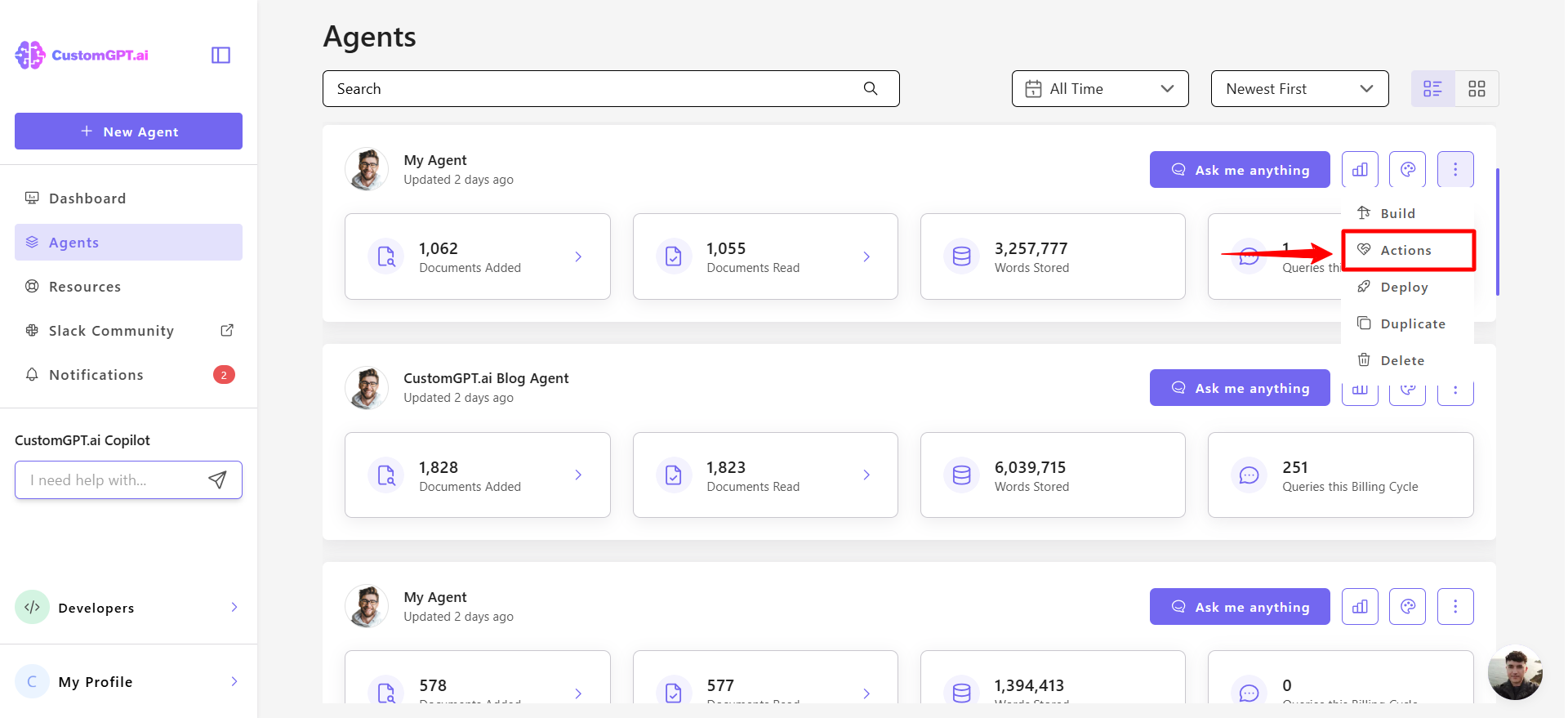 - Click the three dots (⋮) next to the agent you want to configure and select Actions from the dropdown menu