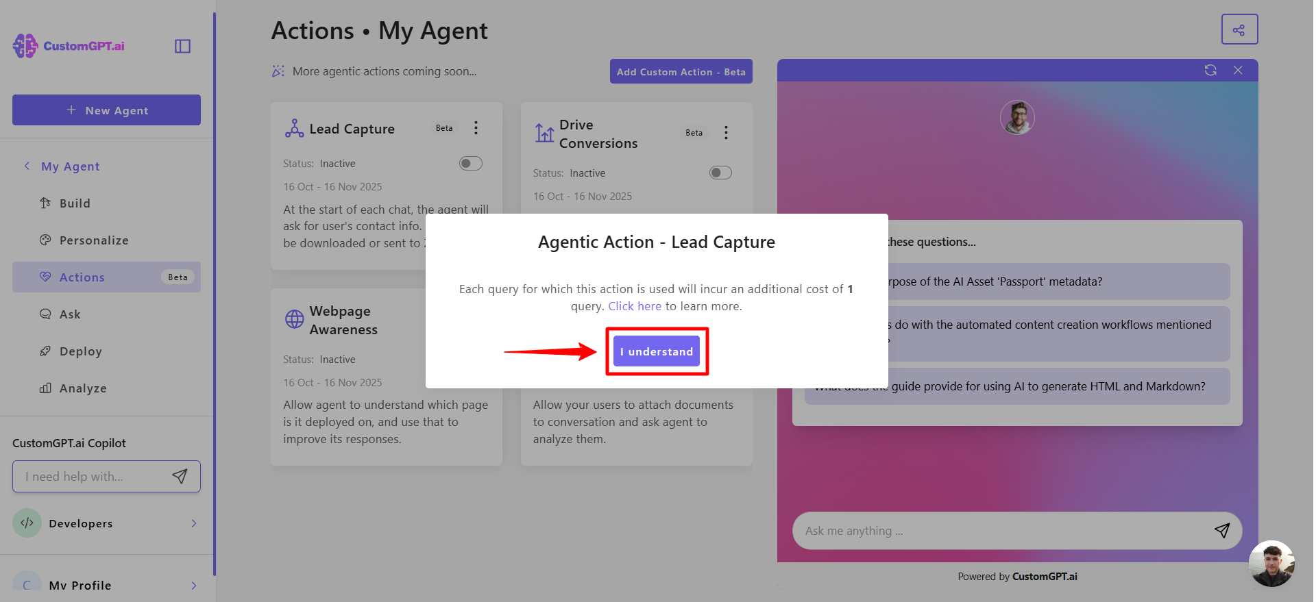 This step-by-step guide explains how to enable the Lead Capture Agentic Action for your CustomGPT.ai agent so it can automatically collect and store user contact information during conversations.