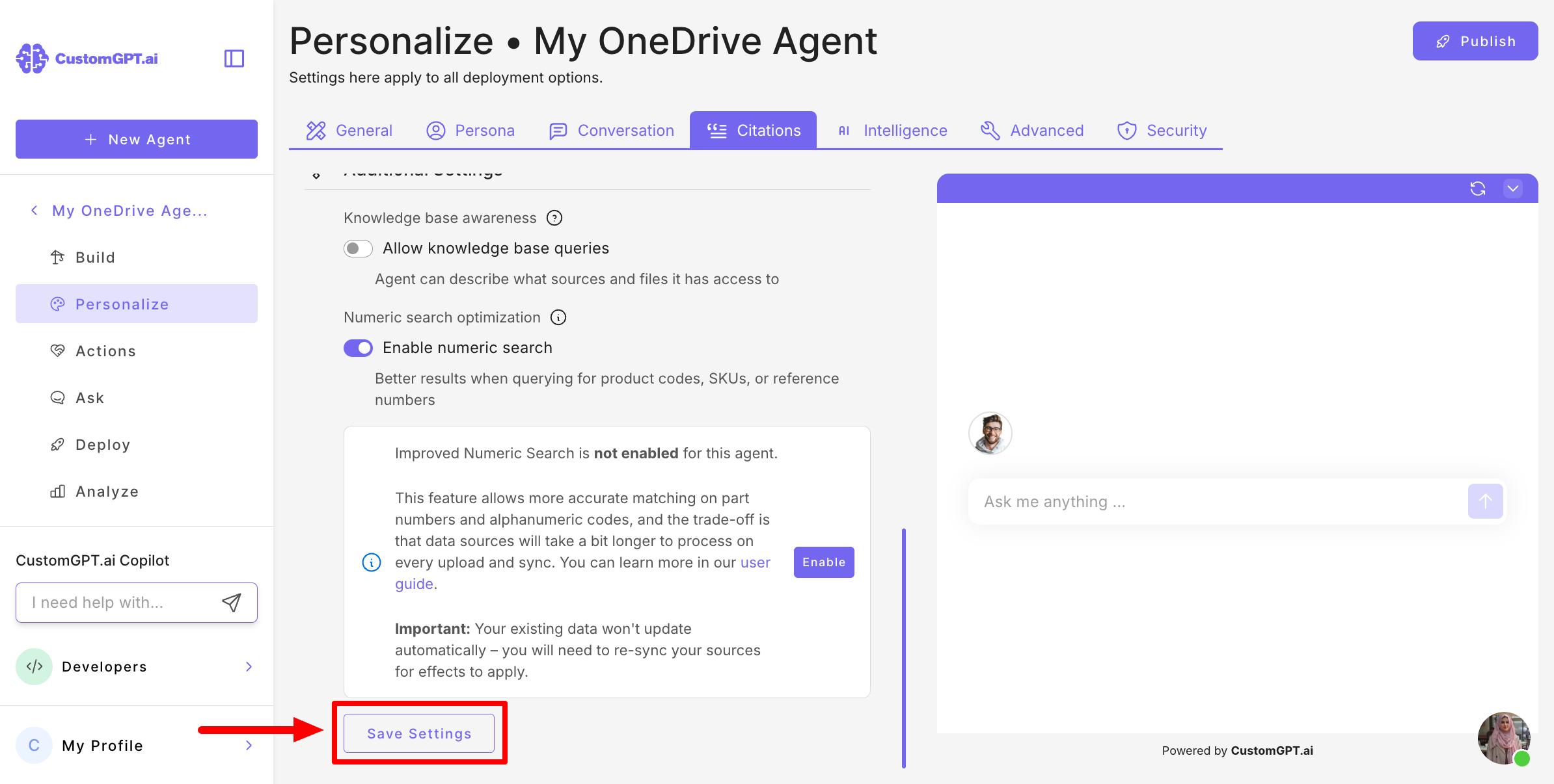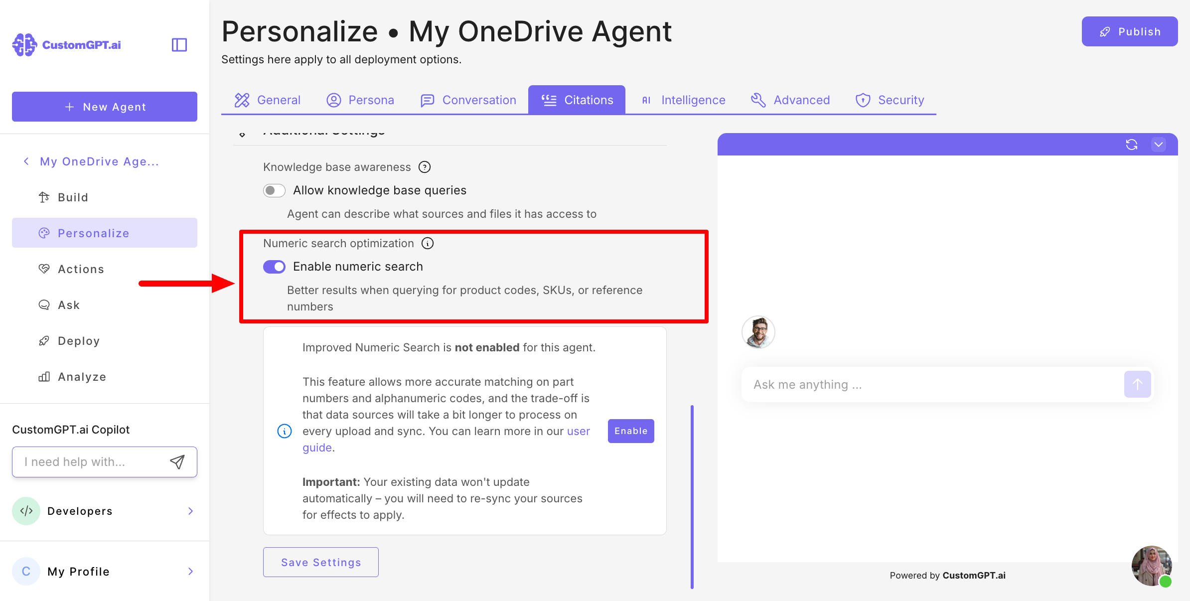 This step-by-step guide explains how to enable Numeric Search in your CustomGPT agent.