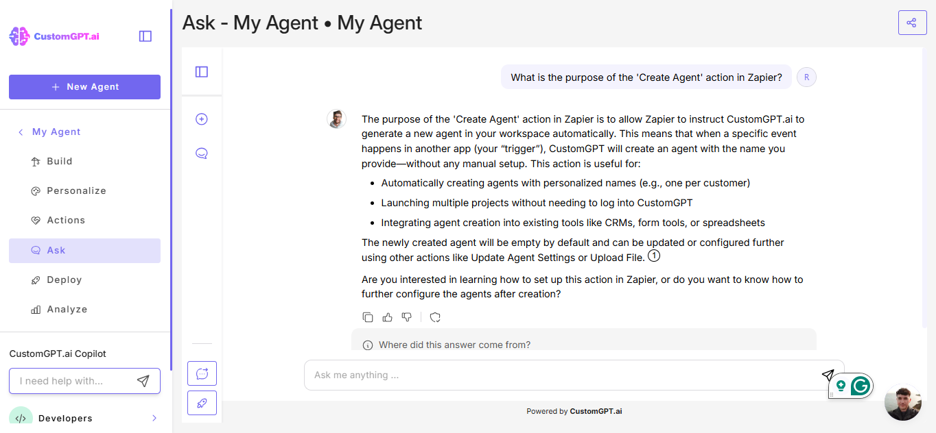 - Start a conversation with your agent on the Ask page and wait for the AI to respond.