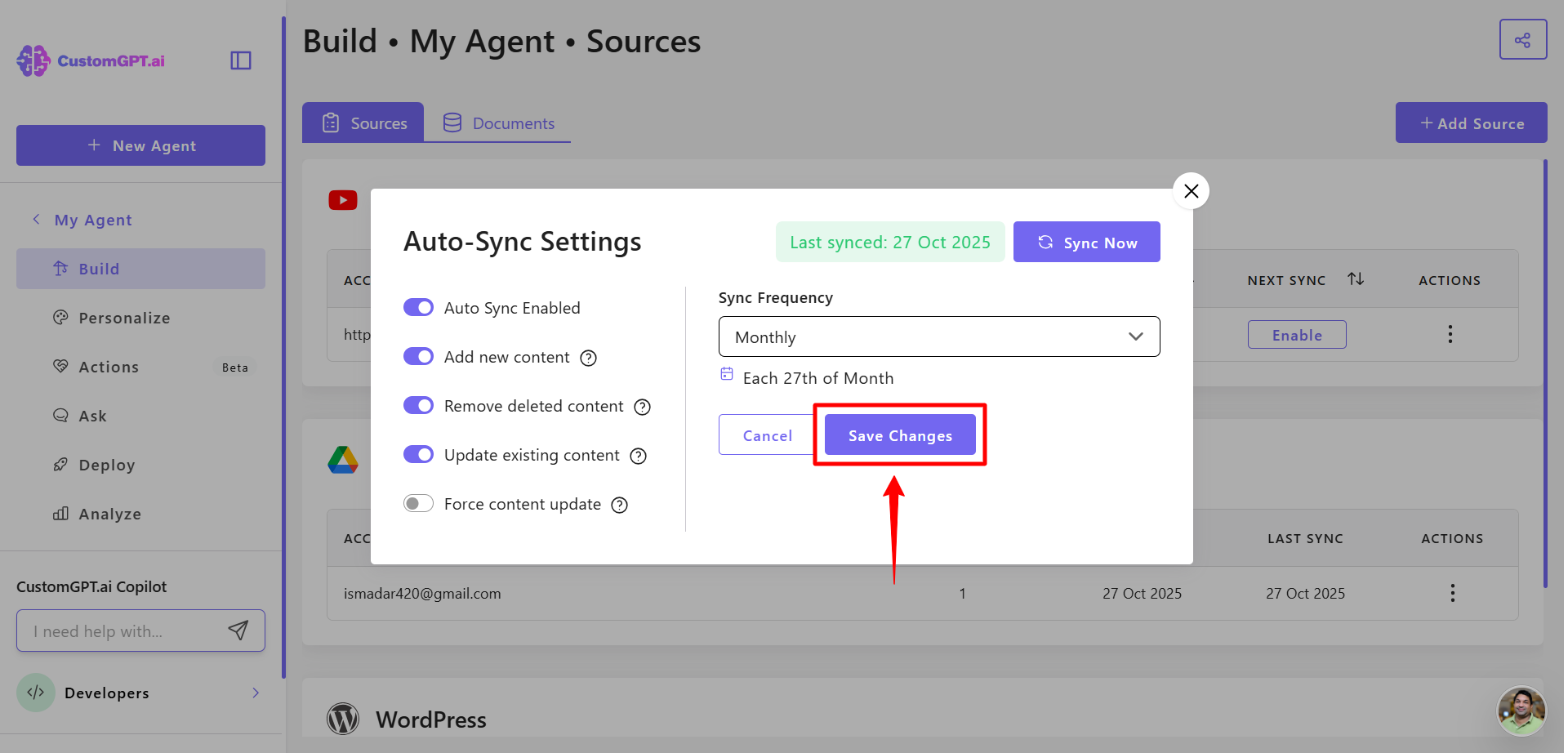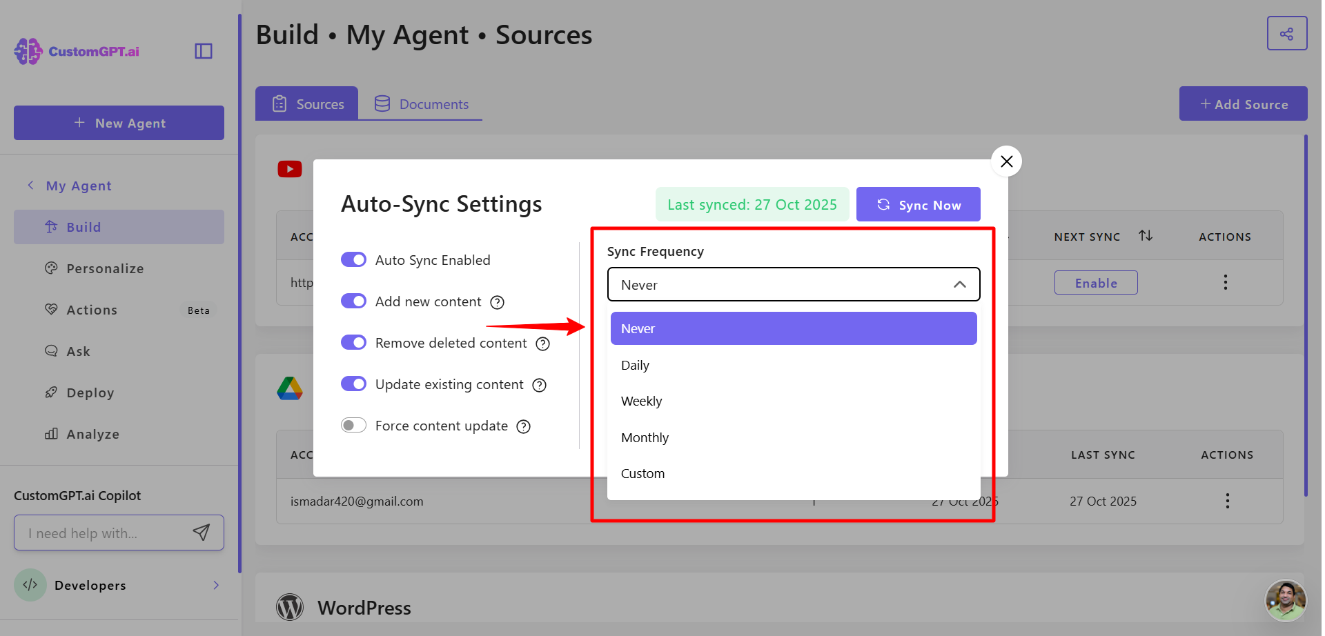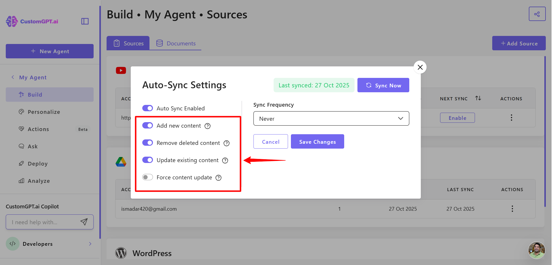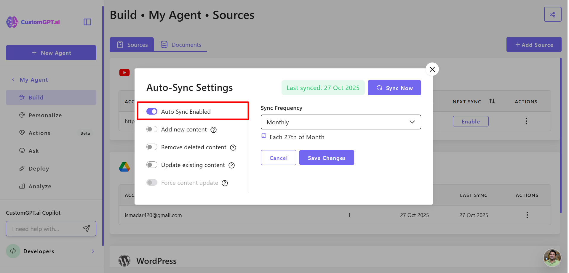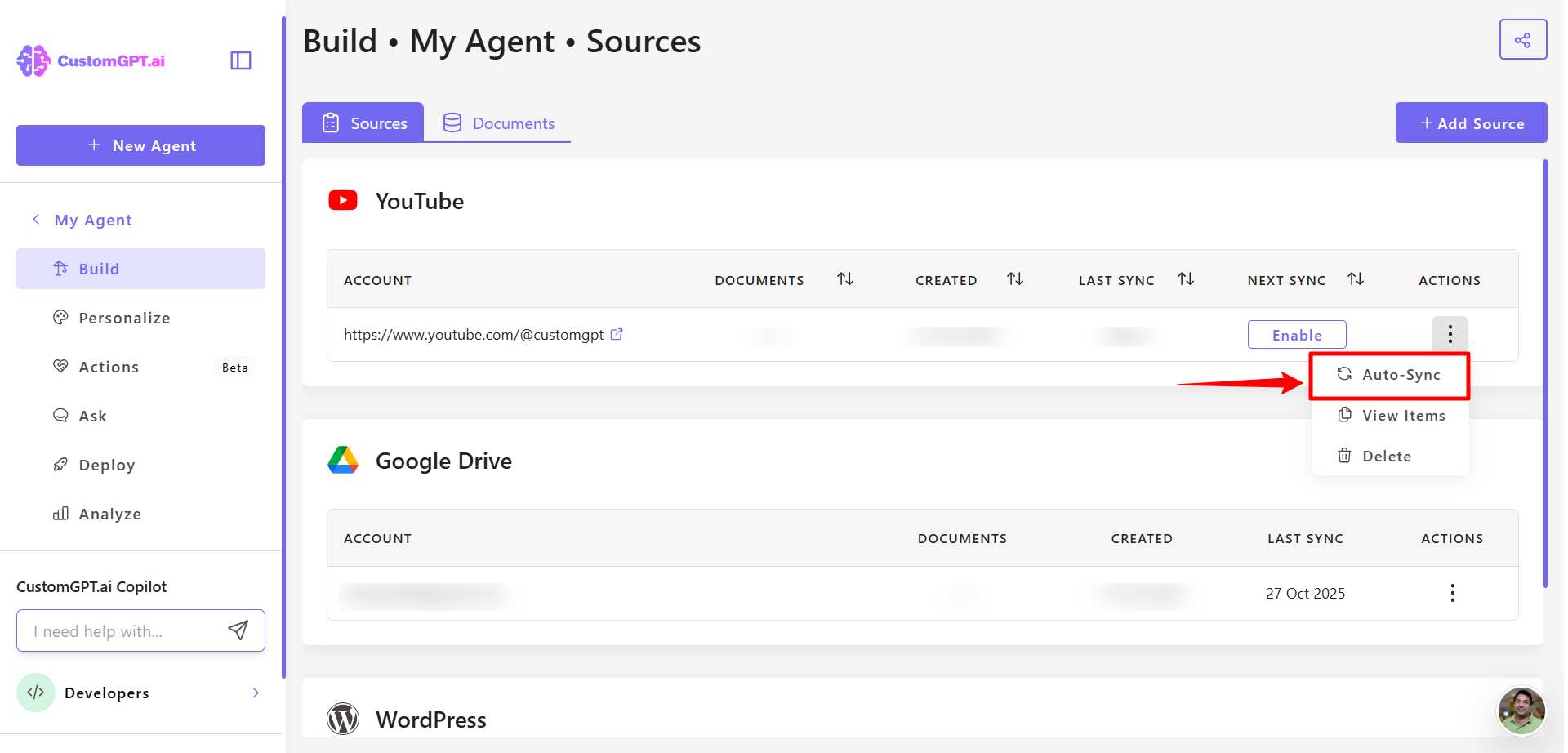 This step-by-step guide shows you how to enable the Auto-Sync feature for YouTube channels in CustomGPT to keep your agent’s video data up to date.