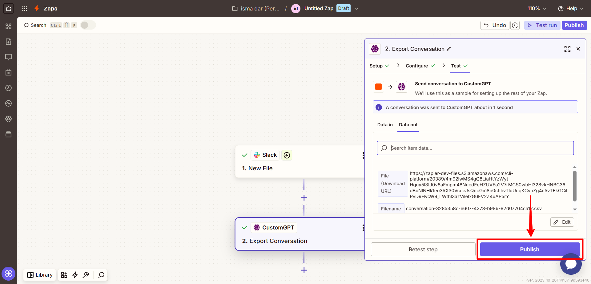 - Once the test is successful, click Publish to activate your Zap.