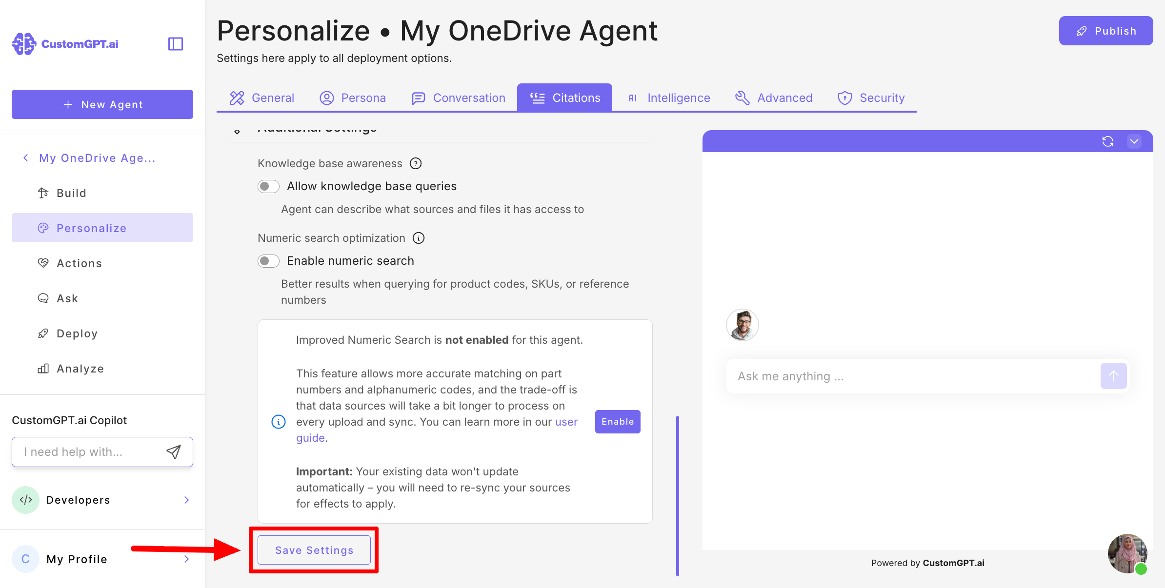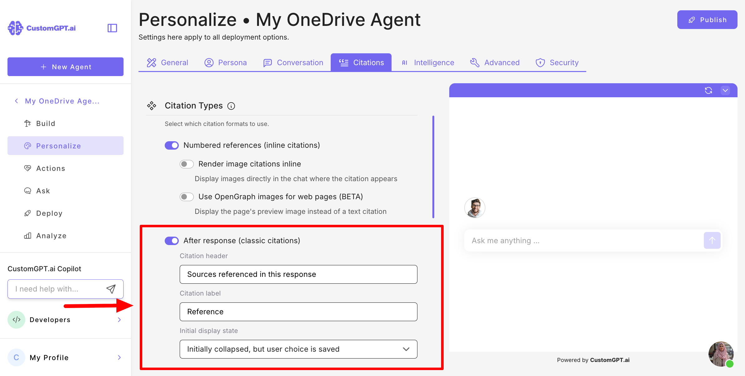 - Under Citation Settings, toggle on Enable Citations. Once enabled, the agent can access and reference source titles and URLs.