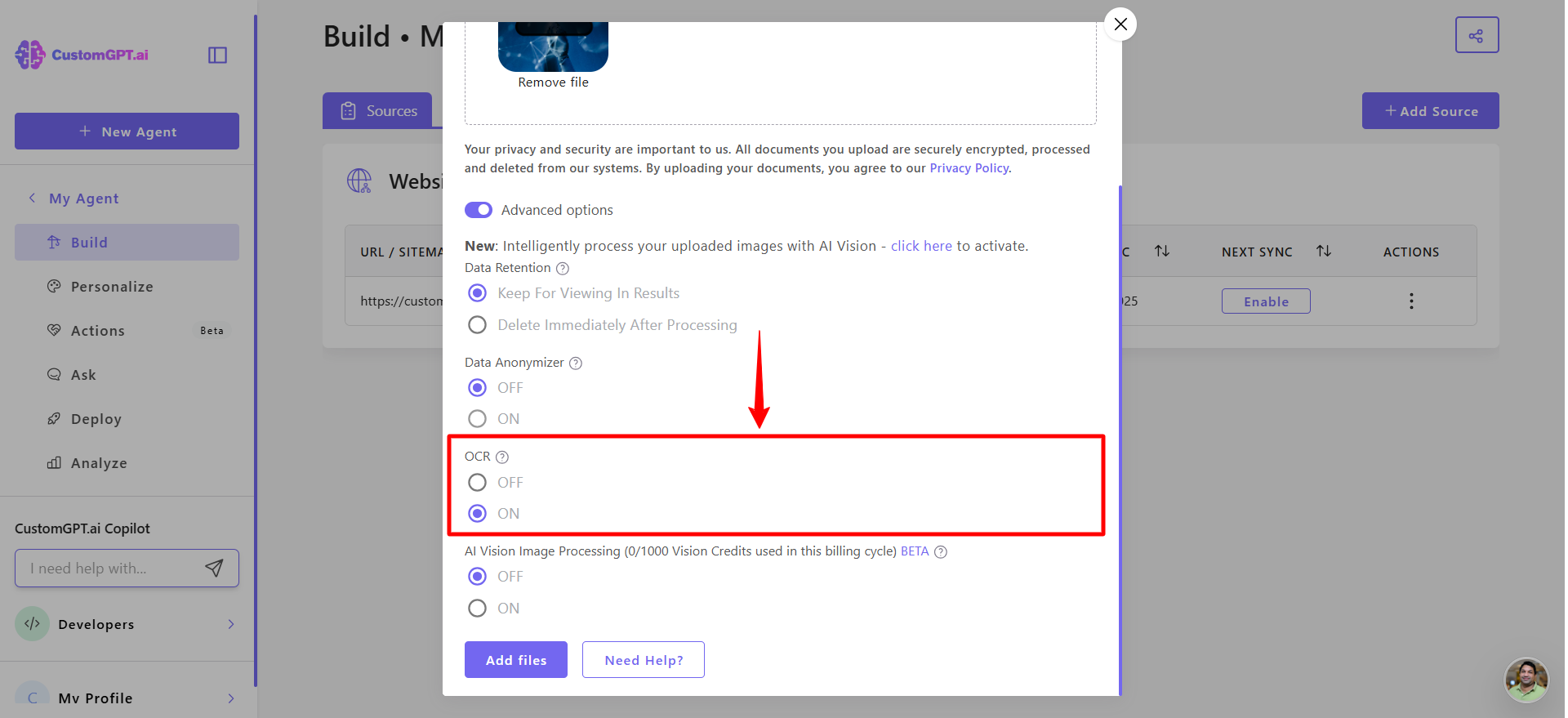 This step-by-step guide explains how to activate the OCR (Optical Character Recognition) feature in CustomGPT.ai.