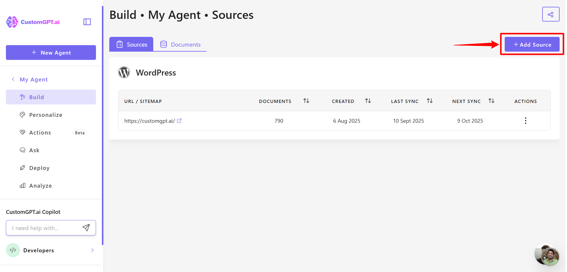 - Click the three dots next to your agentโs name, then select Build.