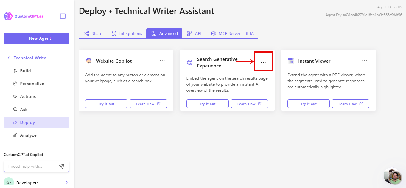 This step-by-step guide explains how to embed a CustomGPT.ai agent on your website’s search results page to provide a Search Generative Experience (SGE).