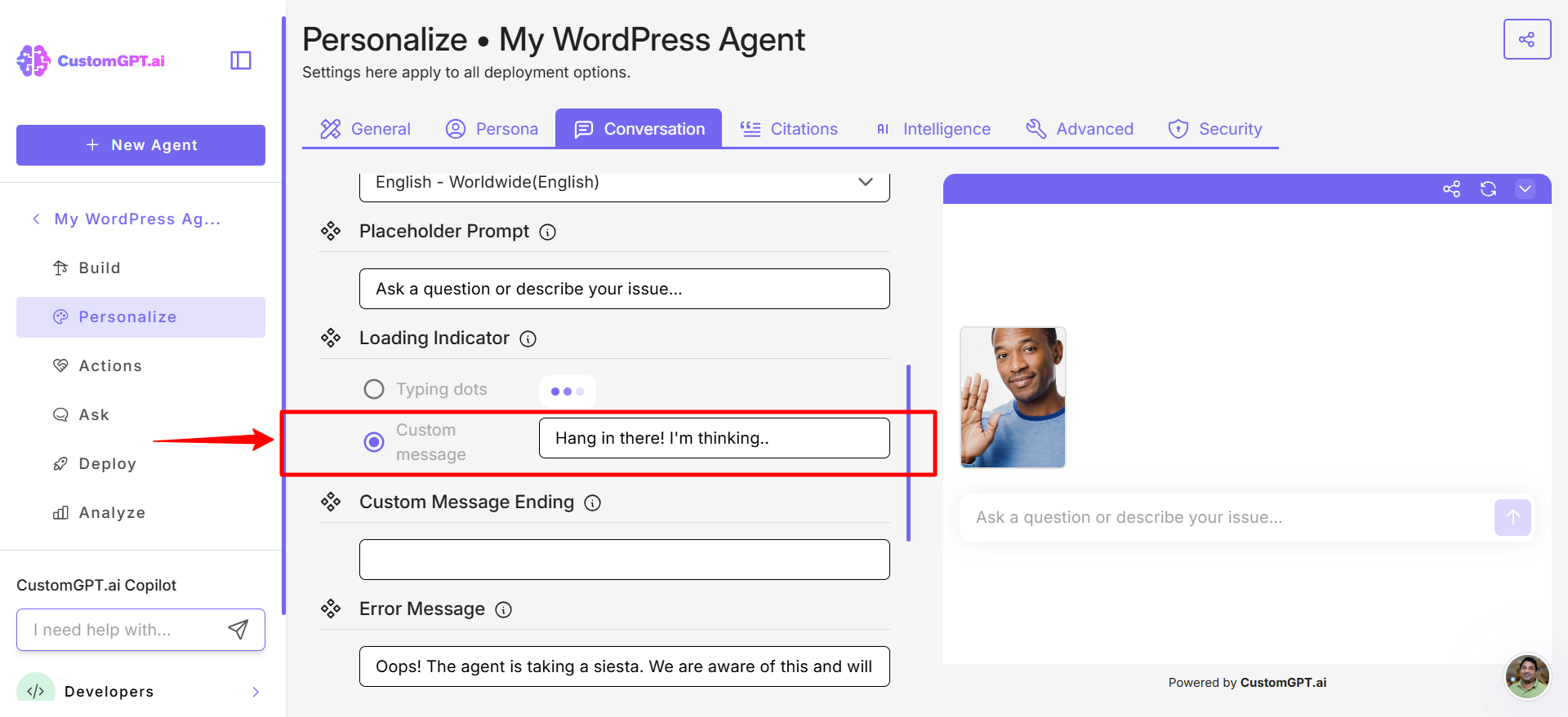 - Custom message – Displays a personalized message. When selected, a text box labeled Hang in there, I'm thinking... appears. Enter the message you want users to see while the AI loads.