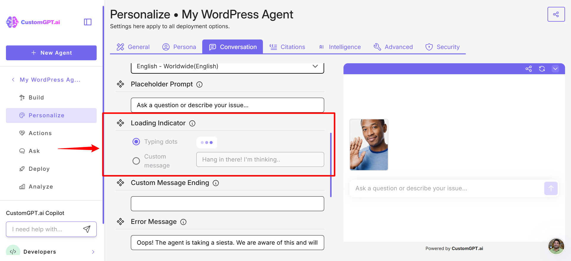 This guide explain you how to customize the loading indicator type for your AI Agent.