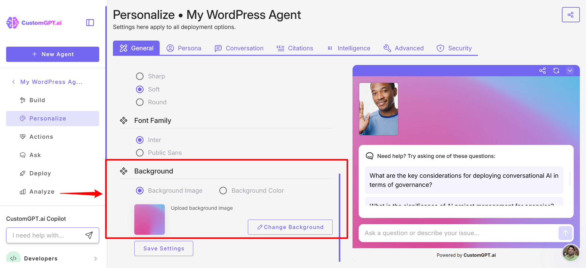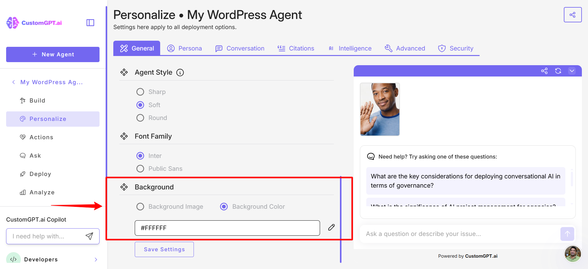 This guide explains how to customize your AI agent’s background using either an image or a solid color.