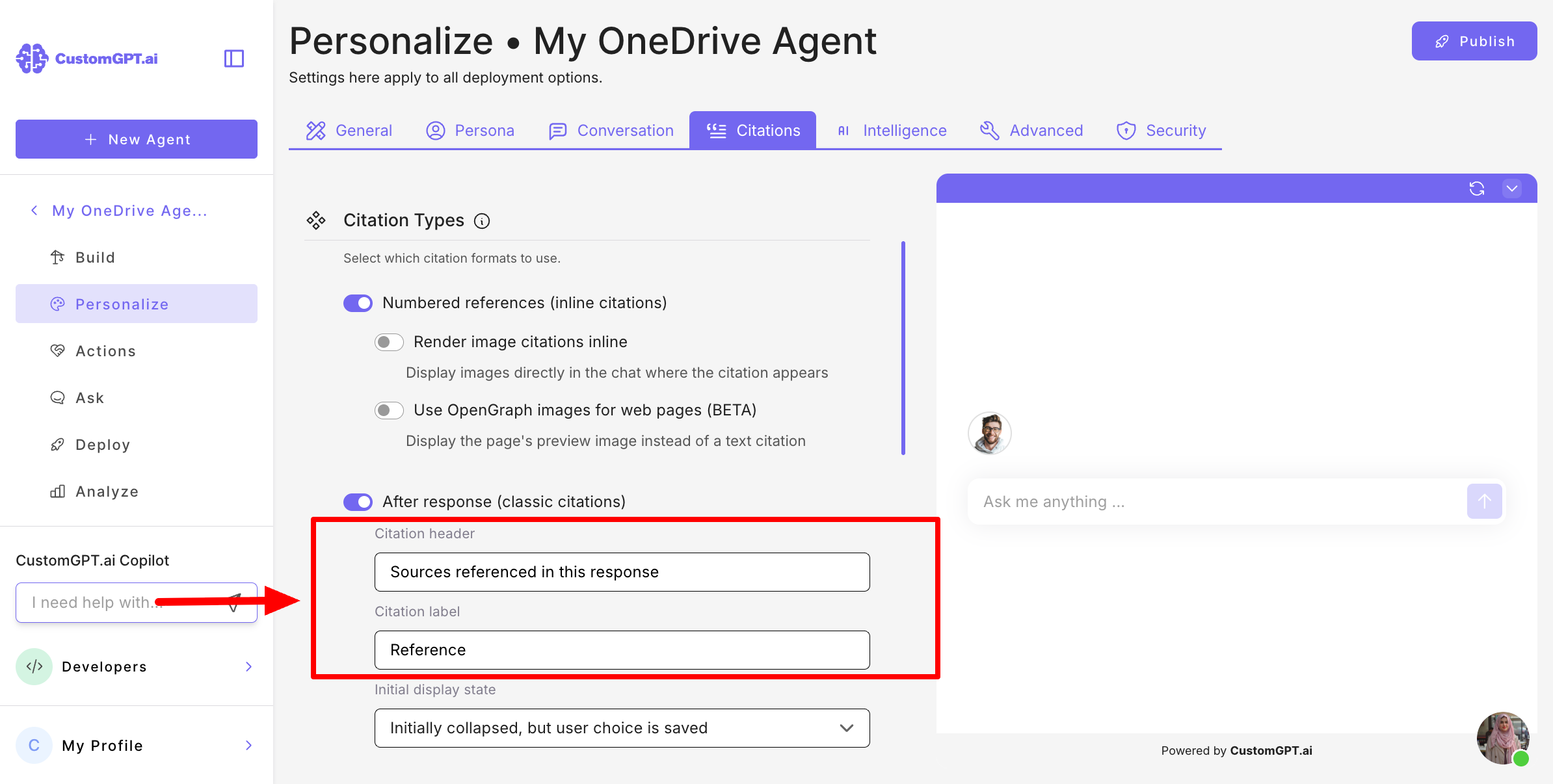 This guide explains how to customize the citation-related messages your AI Agent displays.