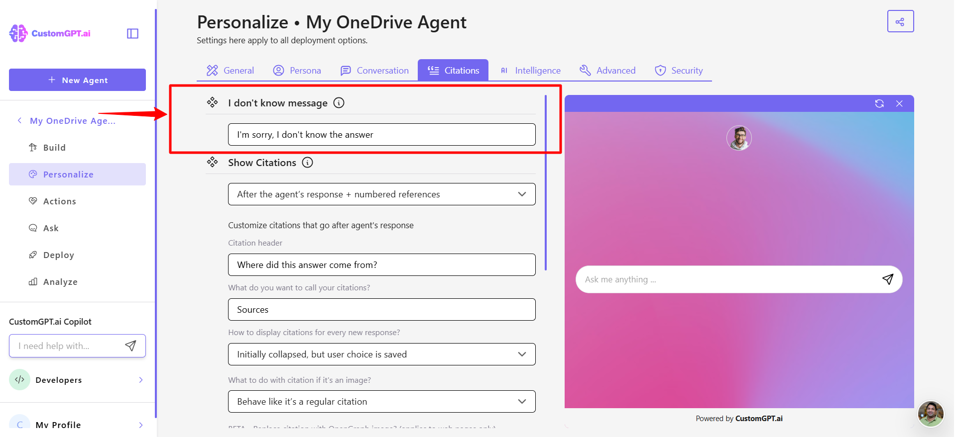 - Scroll to the I don’t know the answer message section and enter the custom message you want your AI Agent to use.