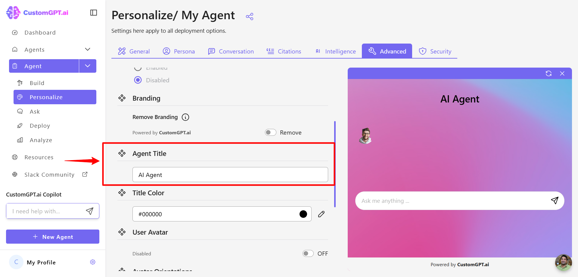 This guide explains how to update the title of your AI agent to personalize its identity in the chat interface.