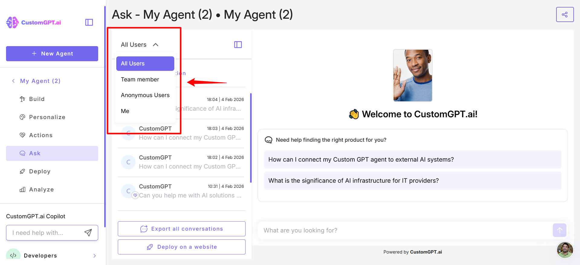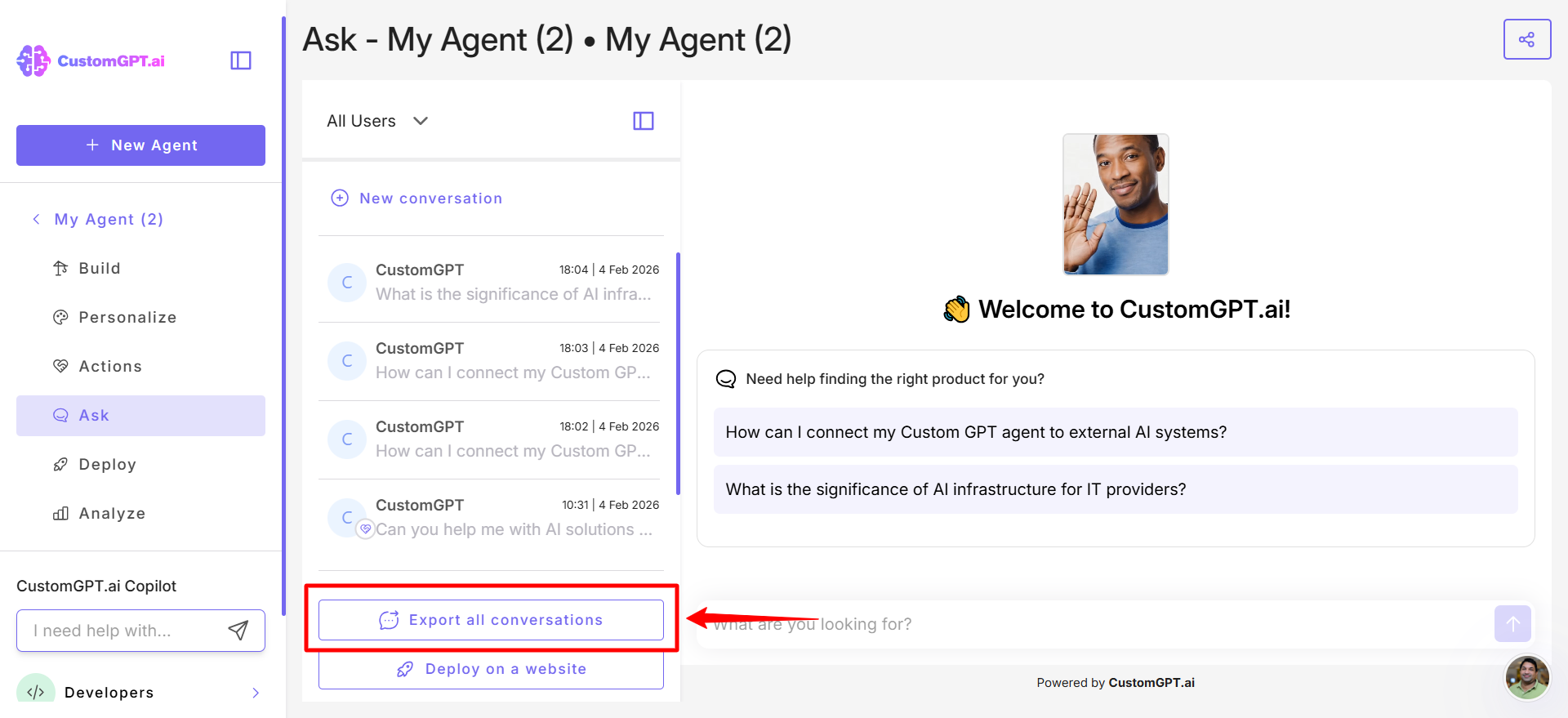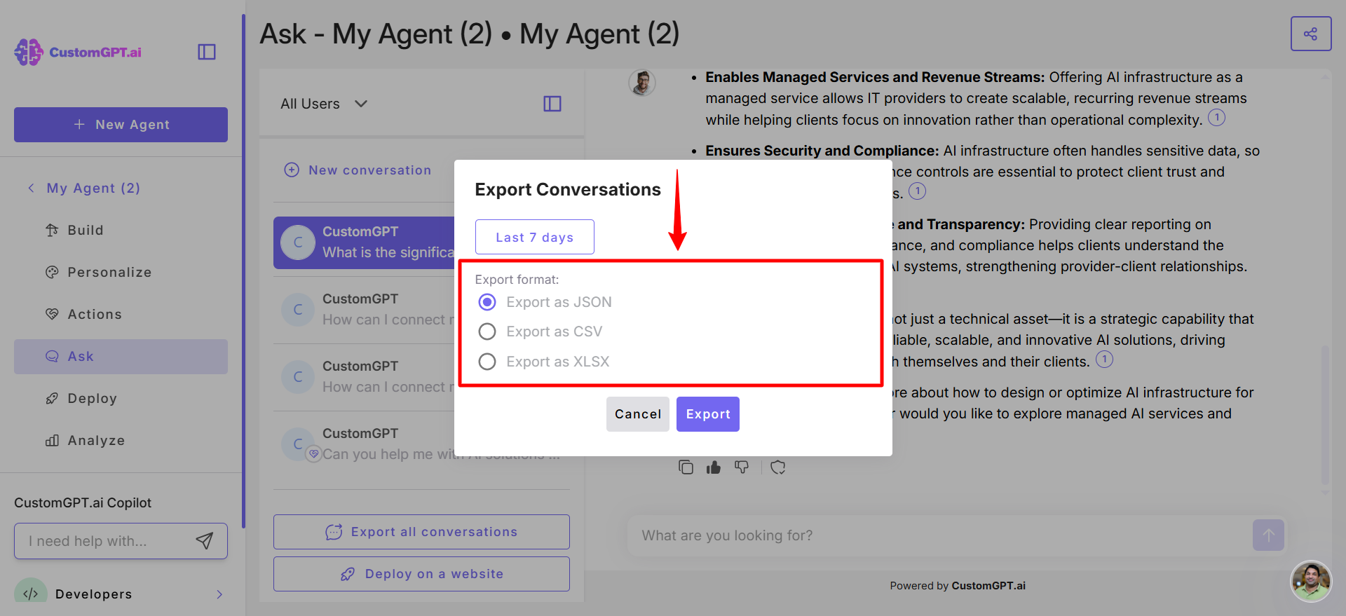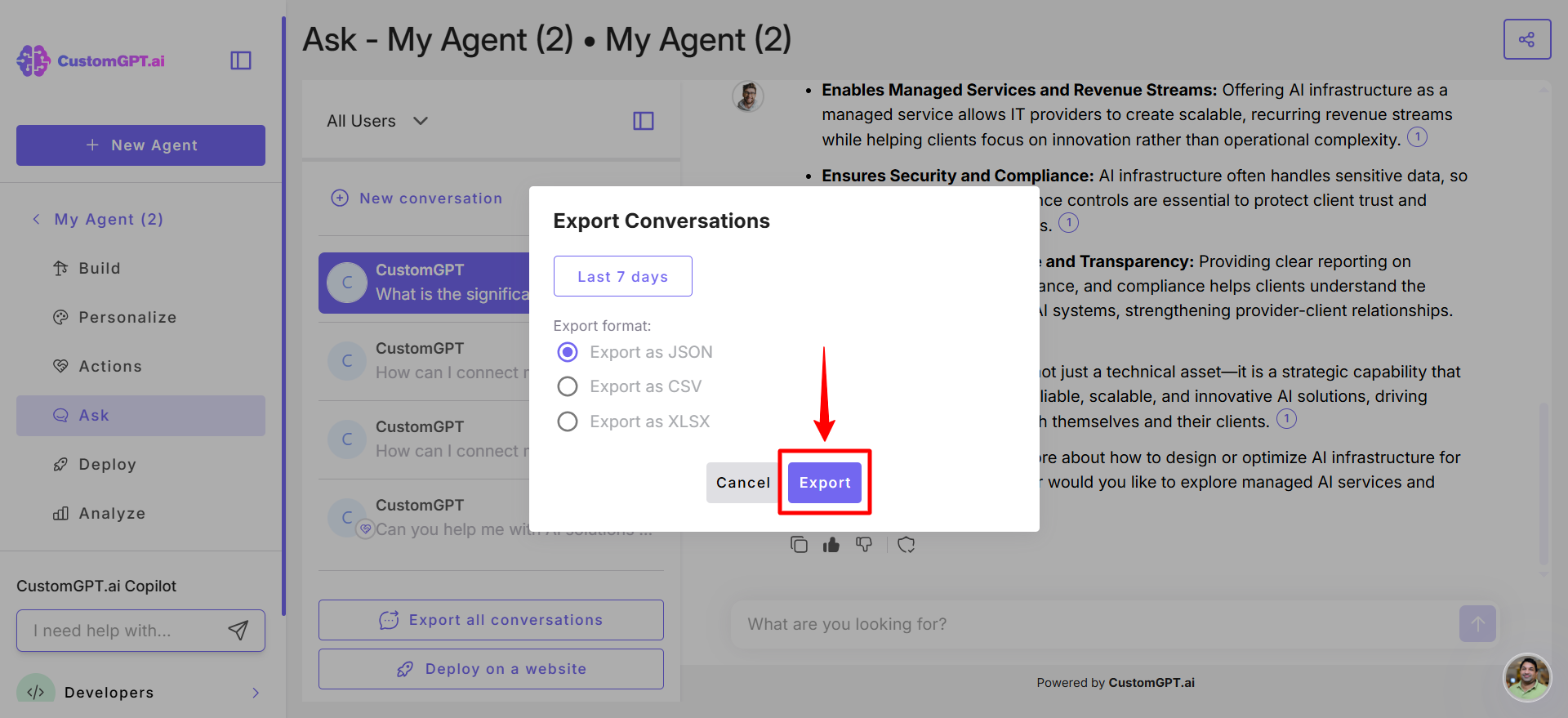 This guide explains how to download your AI agent’s conversation history for review or analysis.