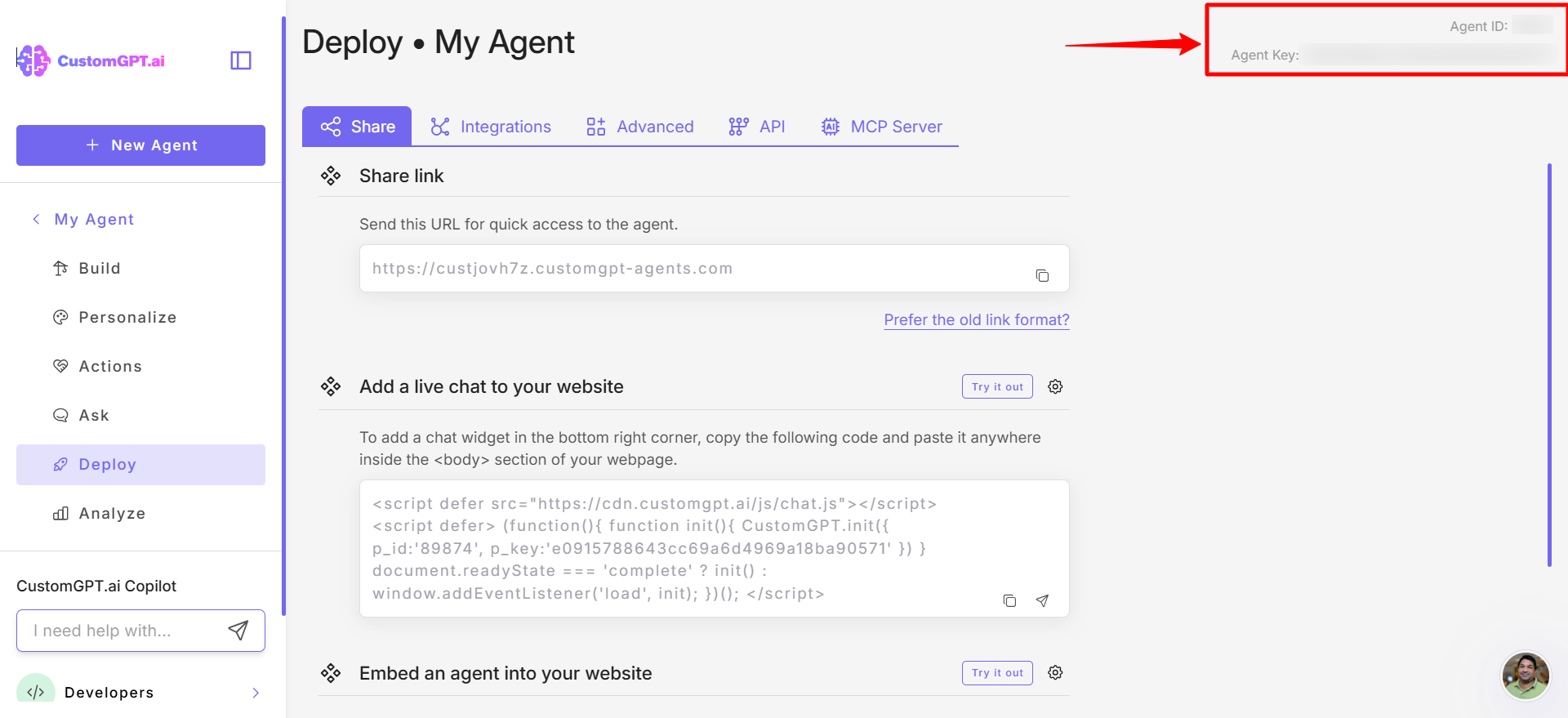 Find your agent ID and agent keyThis guide explains how to locate your agent ID and agent key in CustomGPT. Click the Deploy tab on your agent dashboard. In the top-right corner of the page, find the Agent ID and Agent Key. ⚠️Important:Store these values securely. They are required for integration and should not be shared.Updated 19 days ago Use the search bar to find agentsUnderstand agent’s statusAsk AI