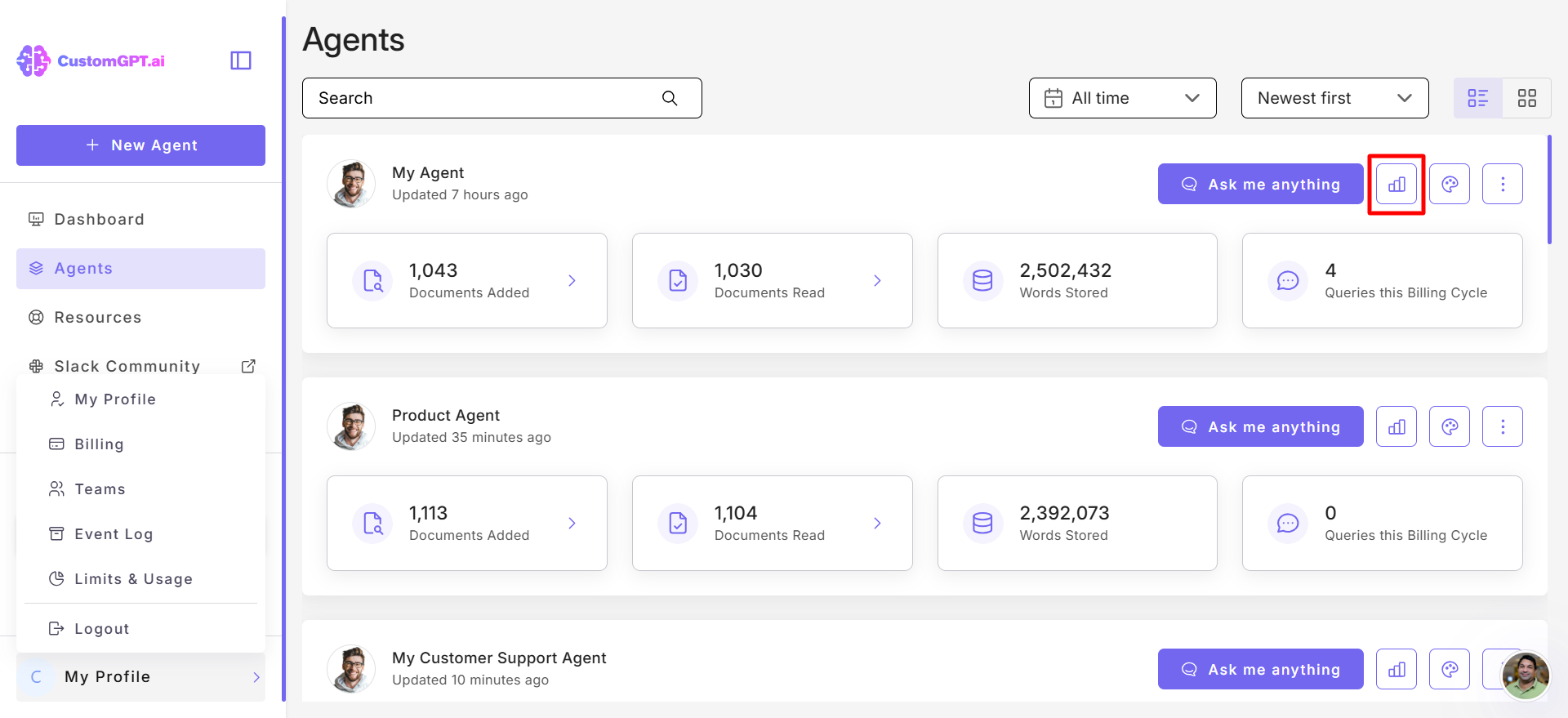 - To see logs for a specific agent, click the Analytics icon next to the agent.