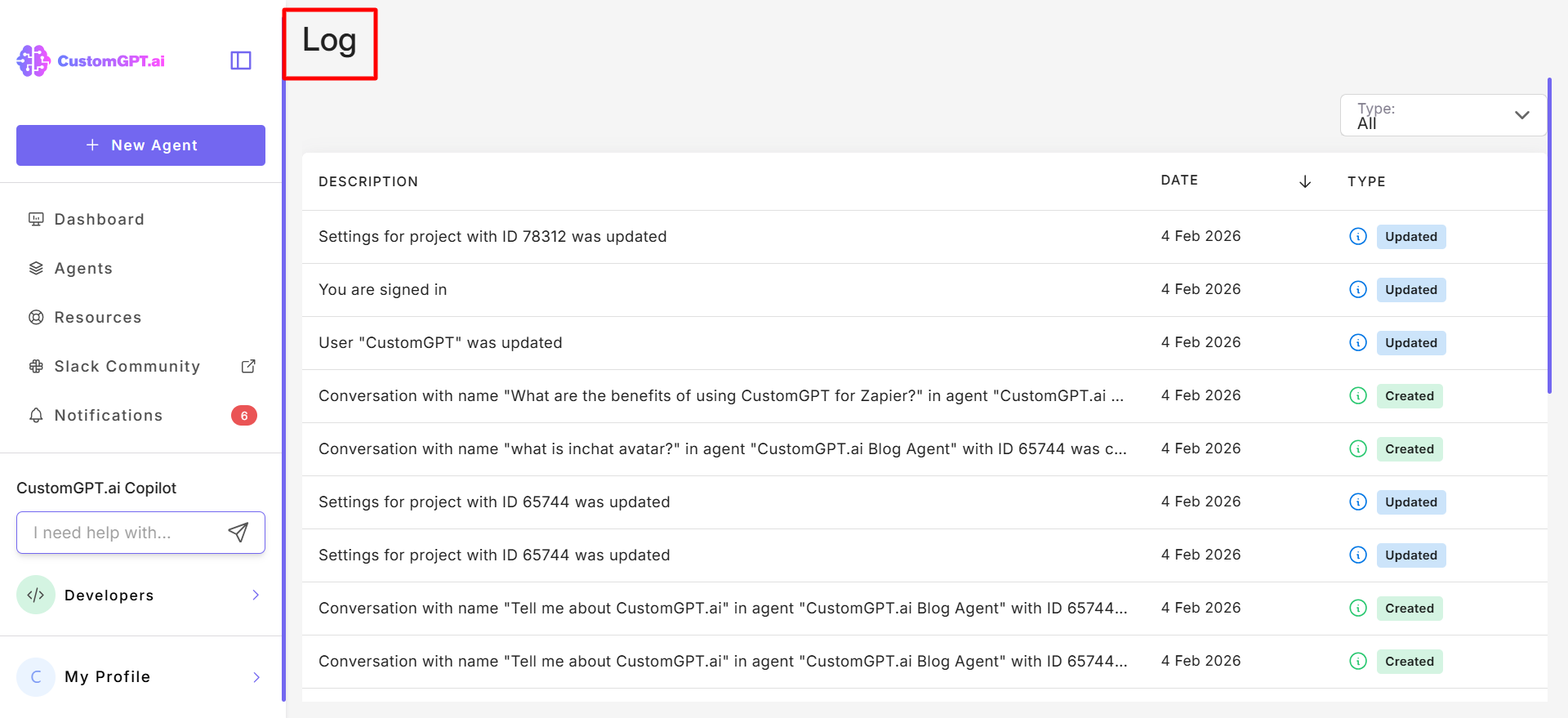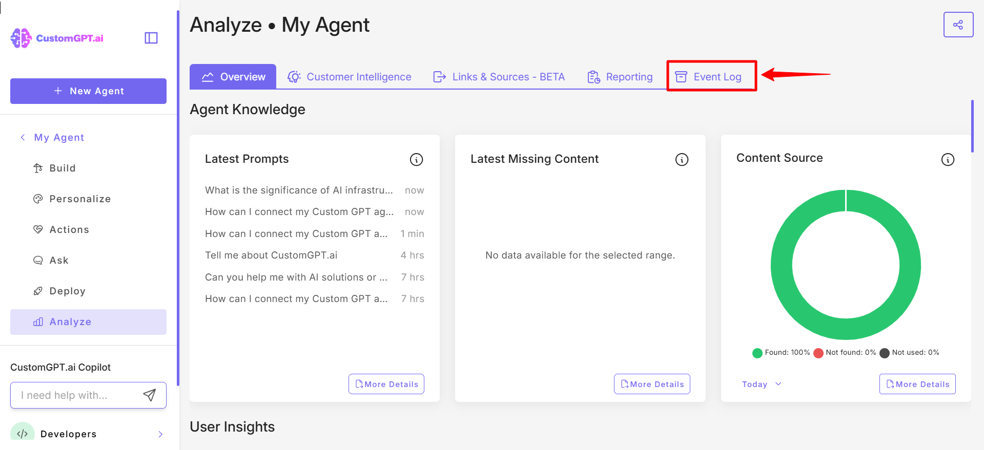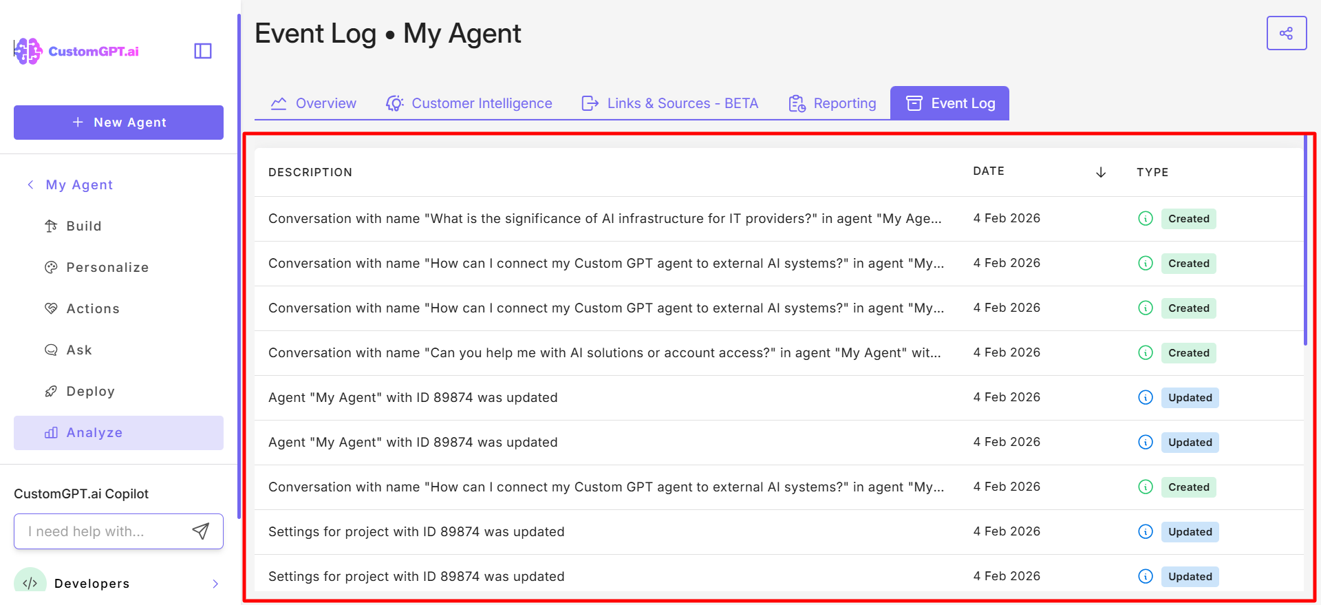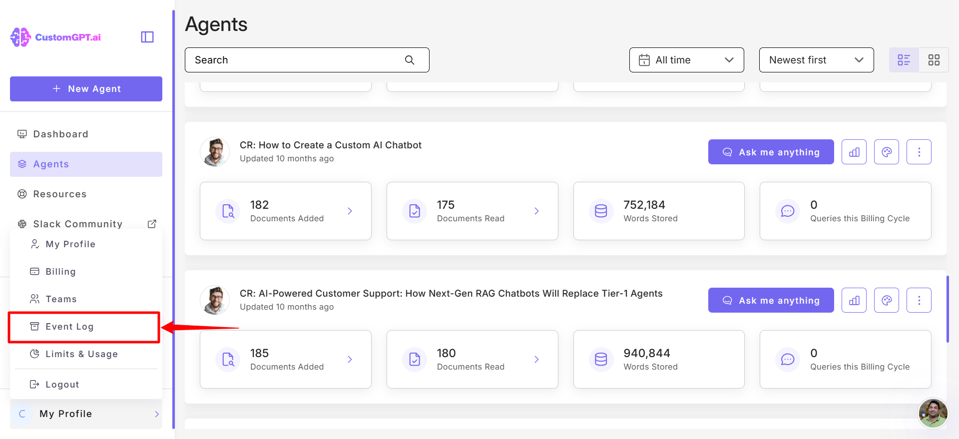 This guide explains how to find and review your AI agent’s event logs in CustomGPT.