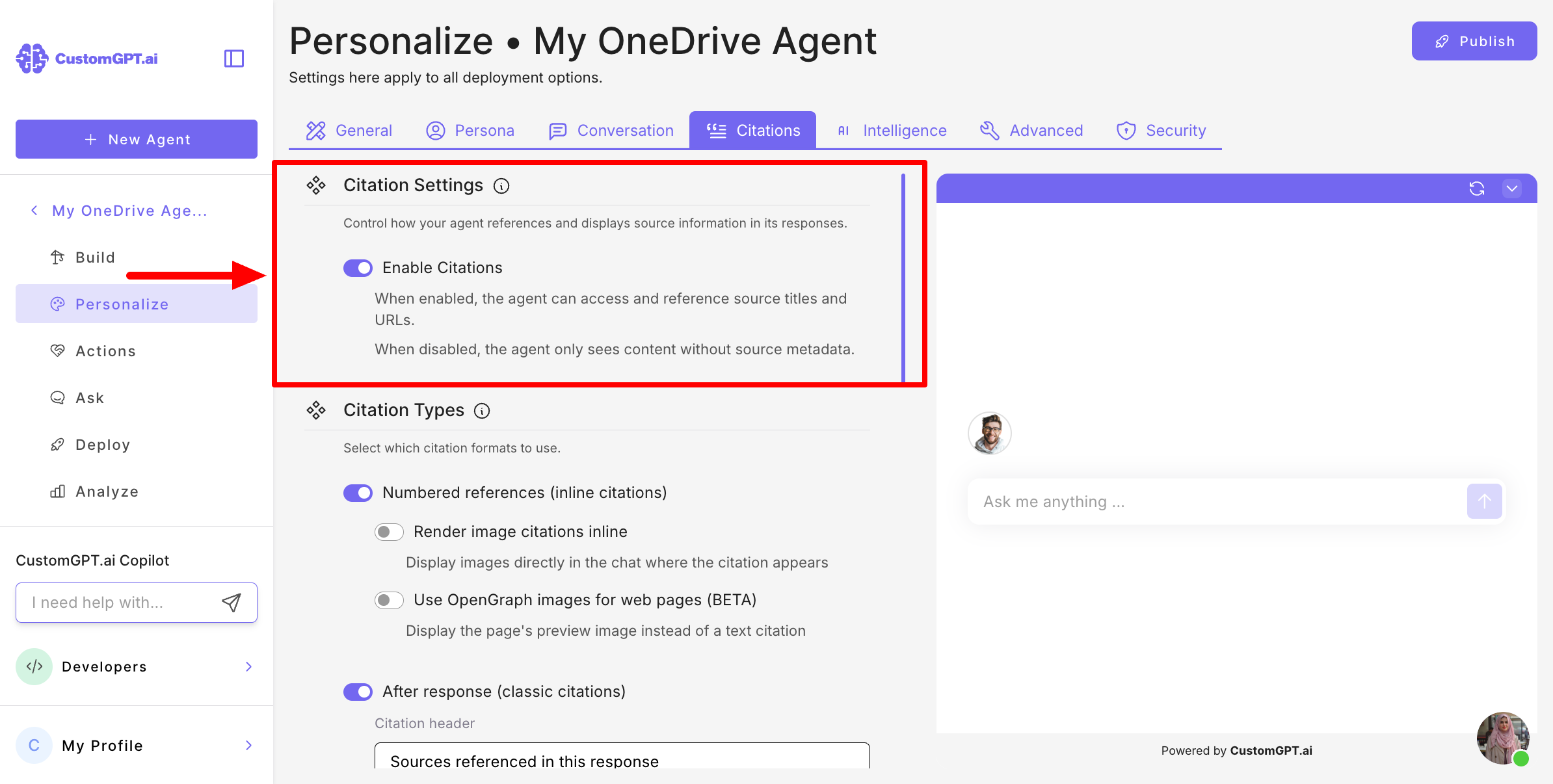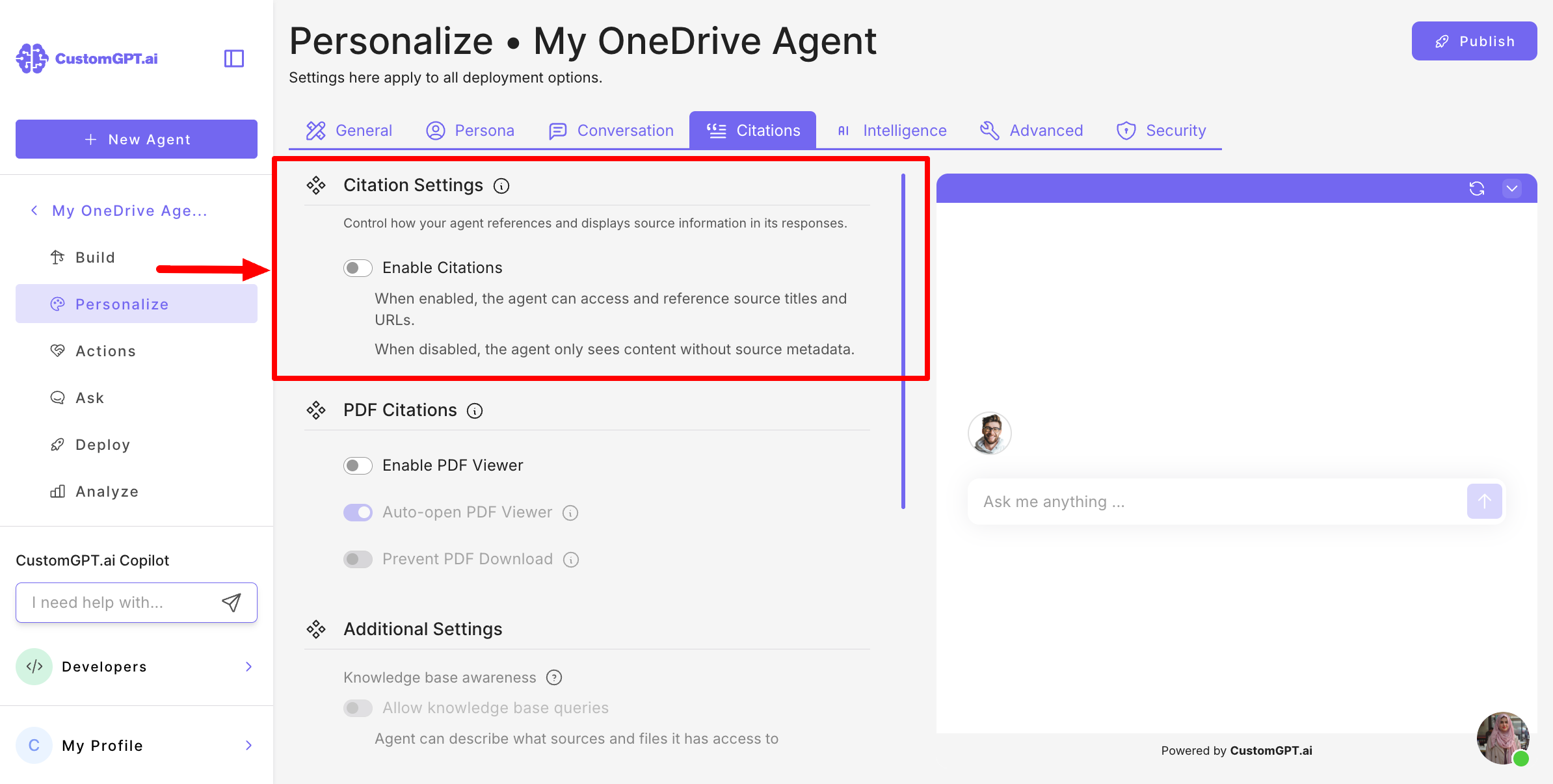 - Under Citation Settings, toggle Enable Citations on or off: