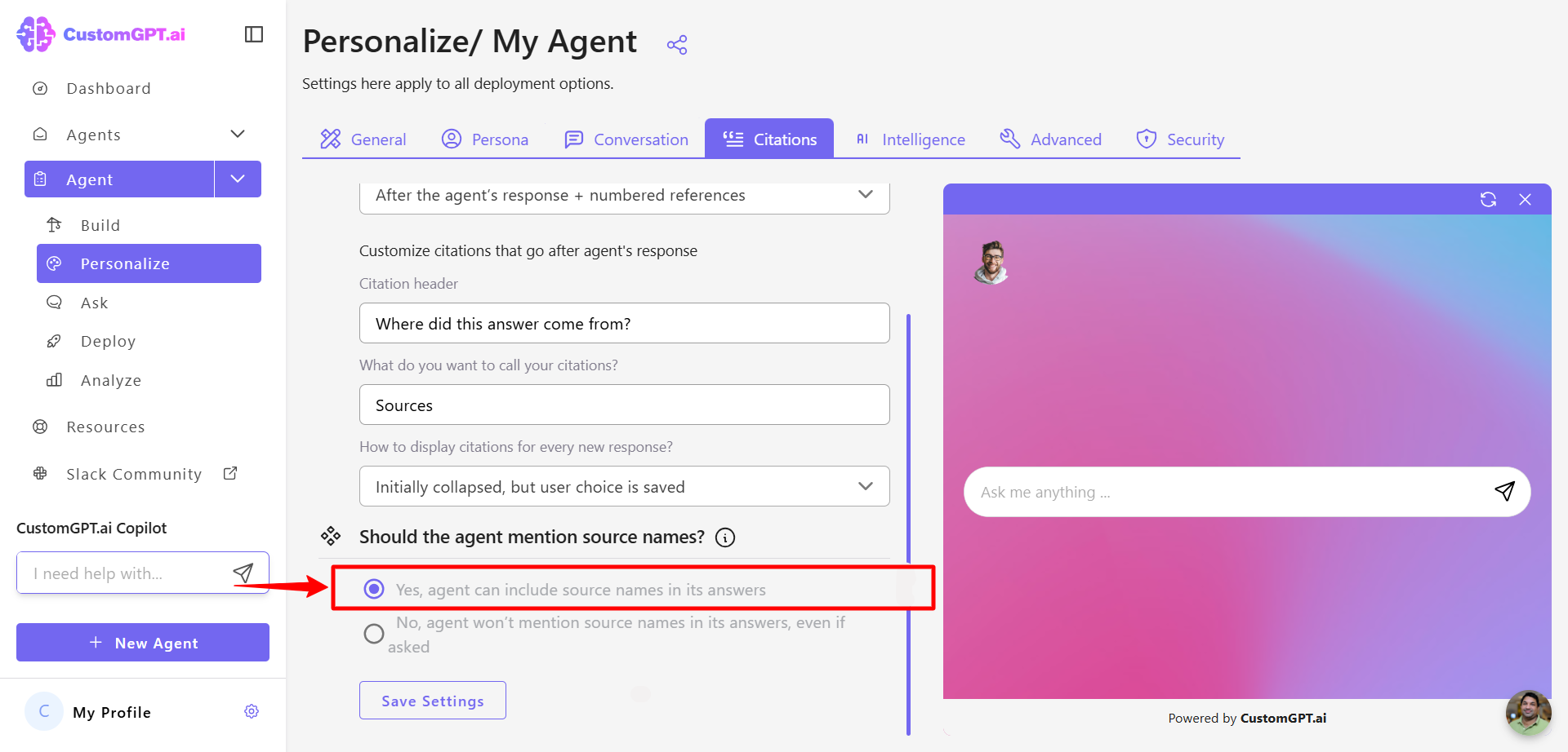 This step-by-step guide explains how to configure your AI Agent to either mention or not mention sources in its responses and in the UI.